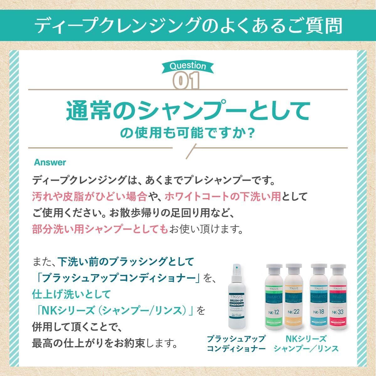 【やさしいのに確かな洗浄力】ラファンシーズのディープクレンジングシャンプーは、被毛と皮フに優しい弱酸性に処方された製品です。汚れた被毛を、ベタベタした被毛を、スッキリ、さらさらに洗い上げます。汚れがひどいワンちゃんネコちゃんの下洗い用シャンプーとして、オイリーコート用として、確かな洗浄力を発揮します。