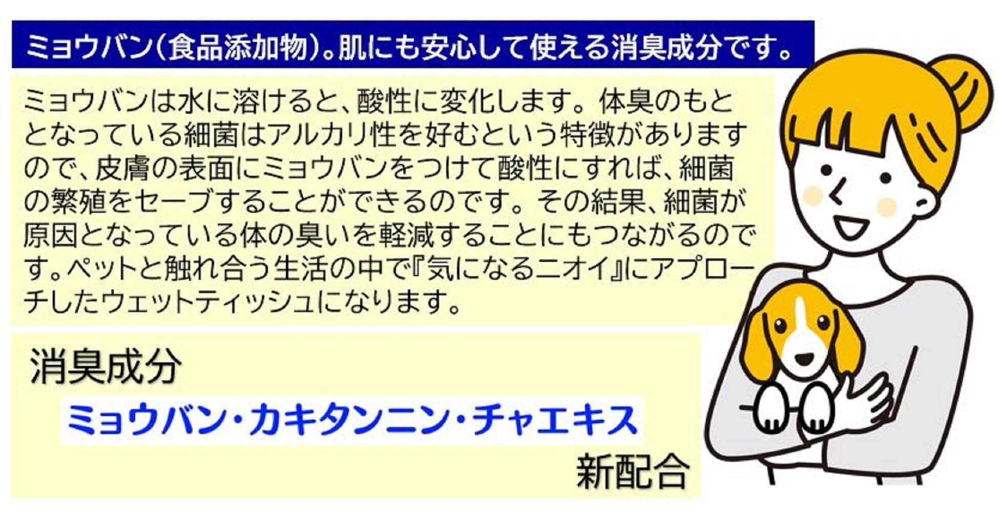 100%食品用原料成分、ミョウバン・カキタンニン・チャエキスの消臭成分を使用したウェットシート