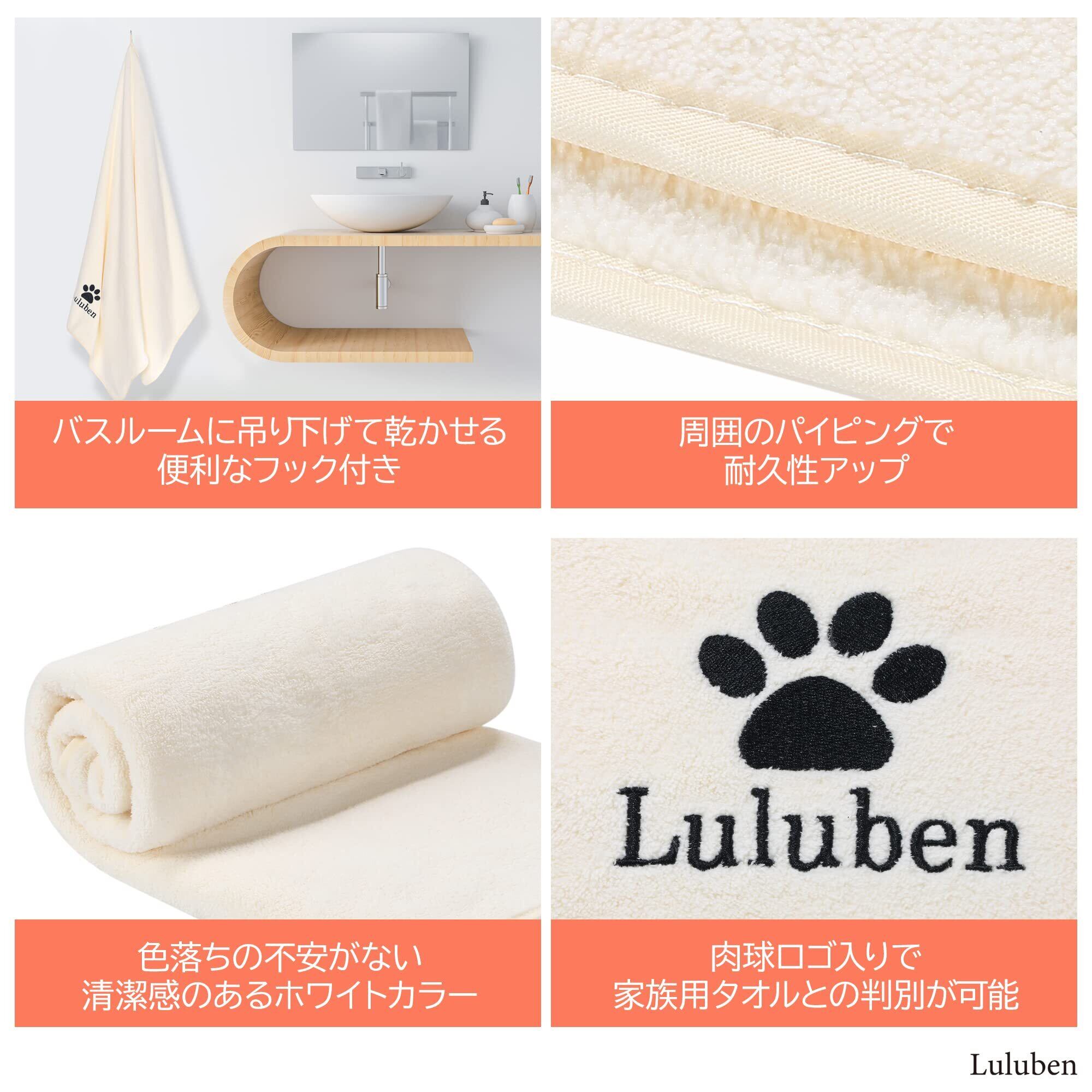 【飼い主さんにもやさしい仕様】○便利なフック付きで、バスルームに吊り下げて乾かせます。○周囲のパイピングで耐久性アップ。○肌触りがよくもこもこふわふわ。○色落ちの不安がないホワイトカラー。○キュートな肉球マーク入りで家族用タオルとの判別がかんたん。