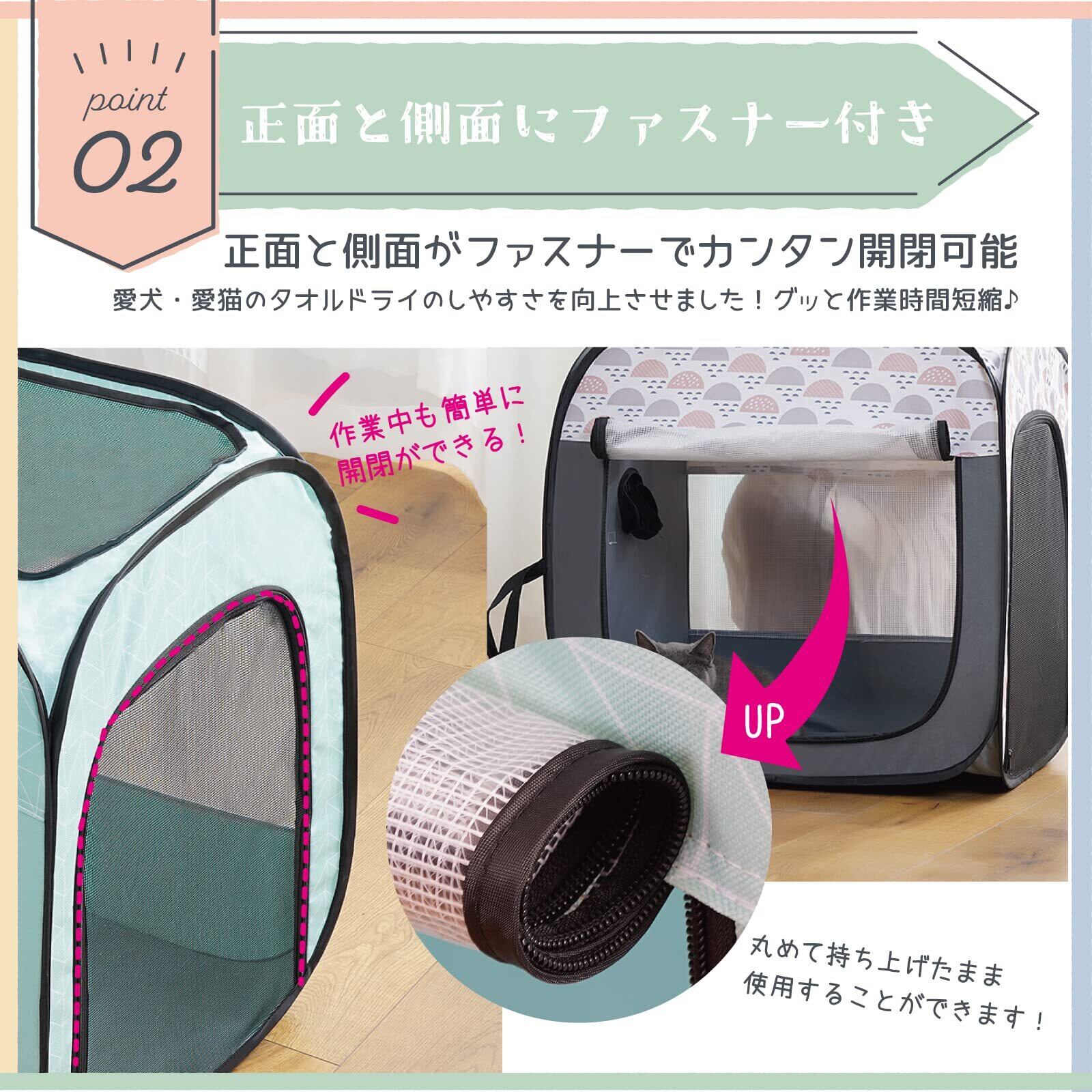 【正面と側面にファスナー付き】正面と側面の計2ヵ所は通気性に優れたメッシュ生地を採用。また、ファスナーを設置し、愛犬・愛猫のタオルドライのしやすさを向上とさせました!側面のファスナー開閉部分にはマジックテープもあるため、丸めた状態で固定していただくことも可能です!