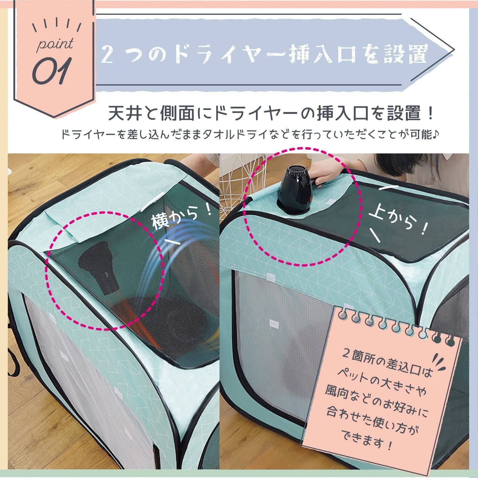 【ドライヤーが固定可能】ドライヤーの差込口を天井と側面に設置!挿入口にはゴムバンドがある為、ドライヤーを差し込んでから固定することができます。ゲージの中からは逃げ出す心配がないため、両手でタオルドライ等を行うことが可能!両手を使うことができることから、大幅な時間短縮を見込め、愛犬・愛猫の負担軽減にも役立ちます。今まで片手でドライヤーやタオルドライを行ってきた方には特に実感して頂ける強みになっております。