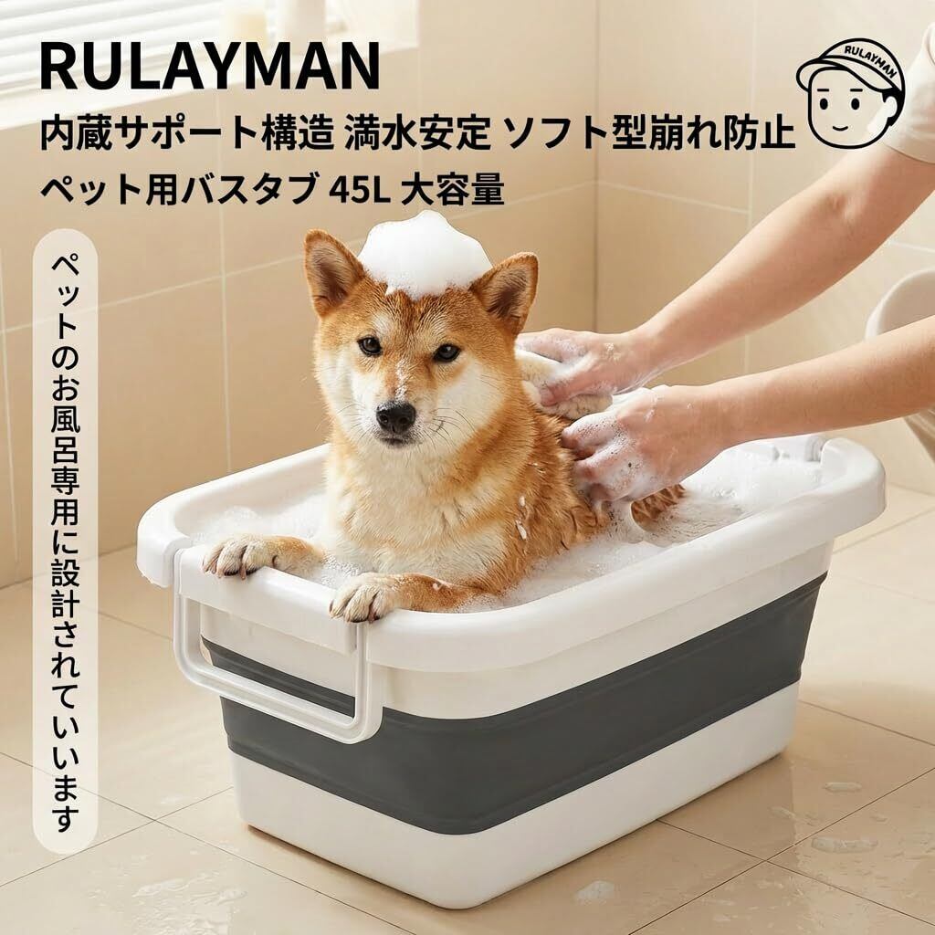 ペット用バスタブ 45L 大容量 折りたたみ 洗い桶 洗濯バケツ 内蔵サポート構造 満水安定 ソフト型崩れ防止 ペット お風呂 猫 犬浴槽 中型犬 柴犬 コーギー スタンダードプードル 持ち運び便利 多機能