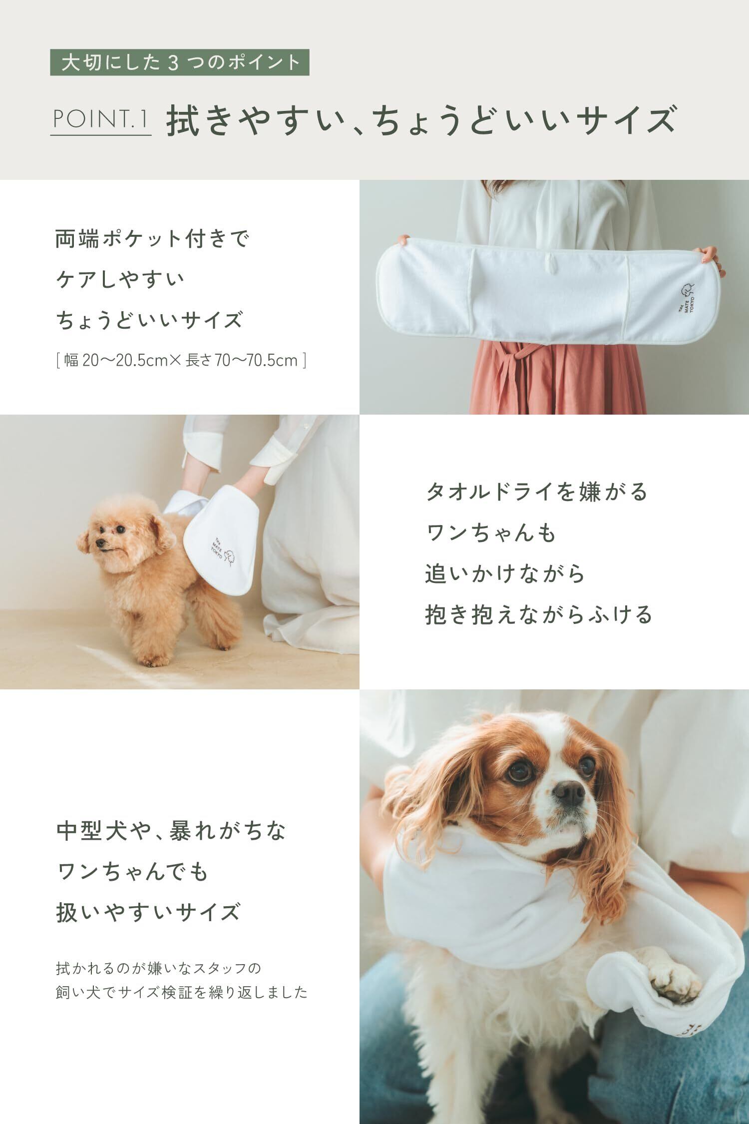 【ポイント①両端ポケット付きで拭きやすいサイズ】 タオルドライを嫌がる愛犬でも、抱き抱えながらふける長めのデザイン。 愛犬を追いかけながらも拭ける!中型犬や、暴れがちな愛犬にも扱いやすいサイズに。拭かれるのが嫌いなスタッフの飼い犬でサイズ検証を繰り返しました。