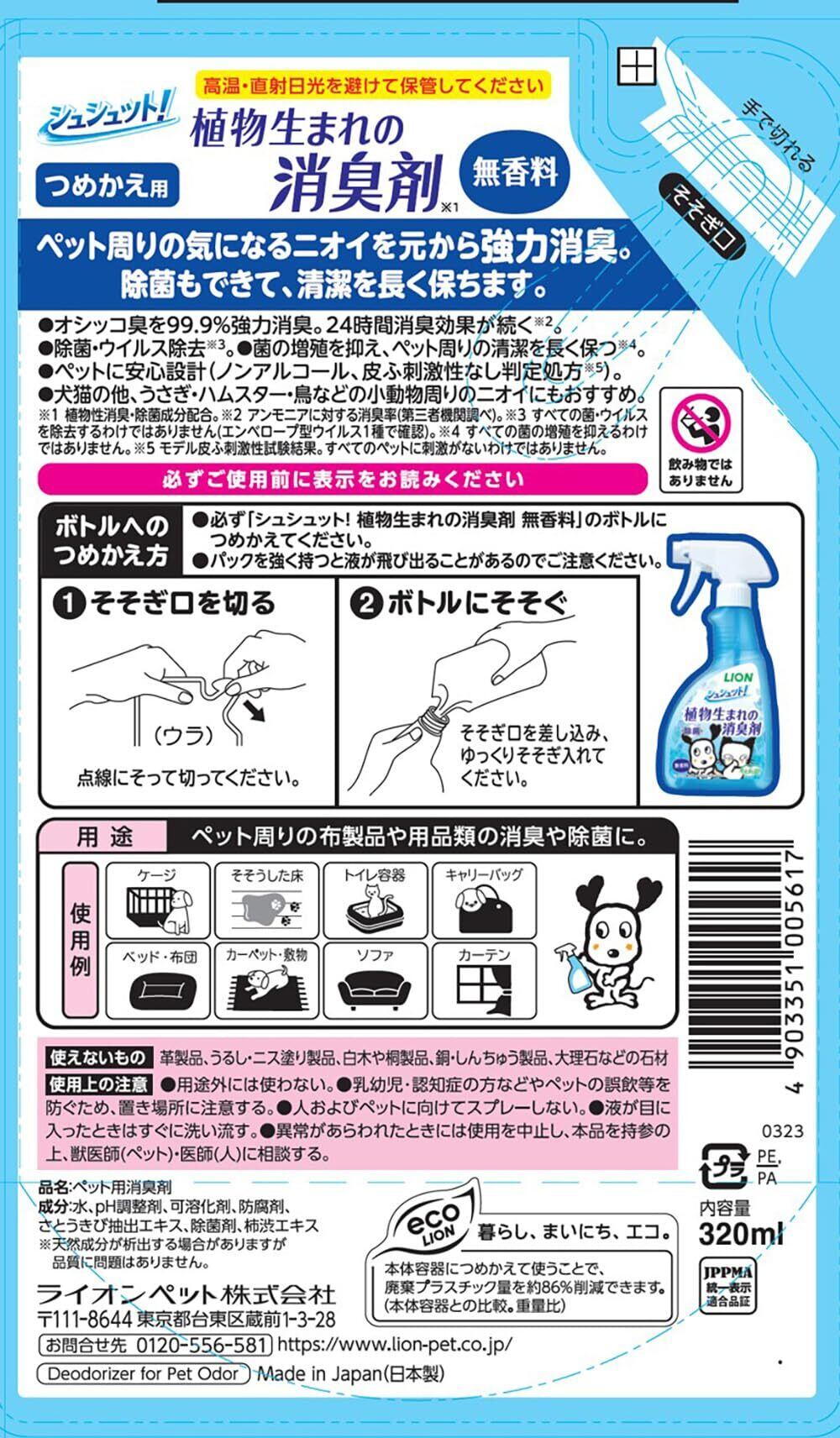 【特価商品】シュシュット! 植物生まれの消臭剤 無香料 つめかえ 320㎖ ライオンペット