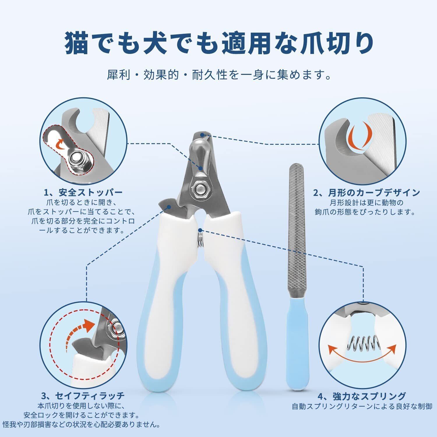 猫 爪切り 初心者用 ペット用爪切 保護ガード 切り過ぎ防止 犬 爪切り 爪やすり付き 持ちやすい ネイルケア 安全安心 猫犬兼用 (水色)