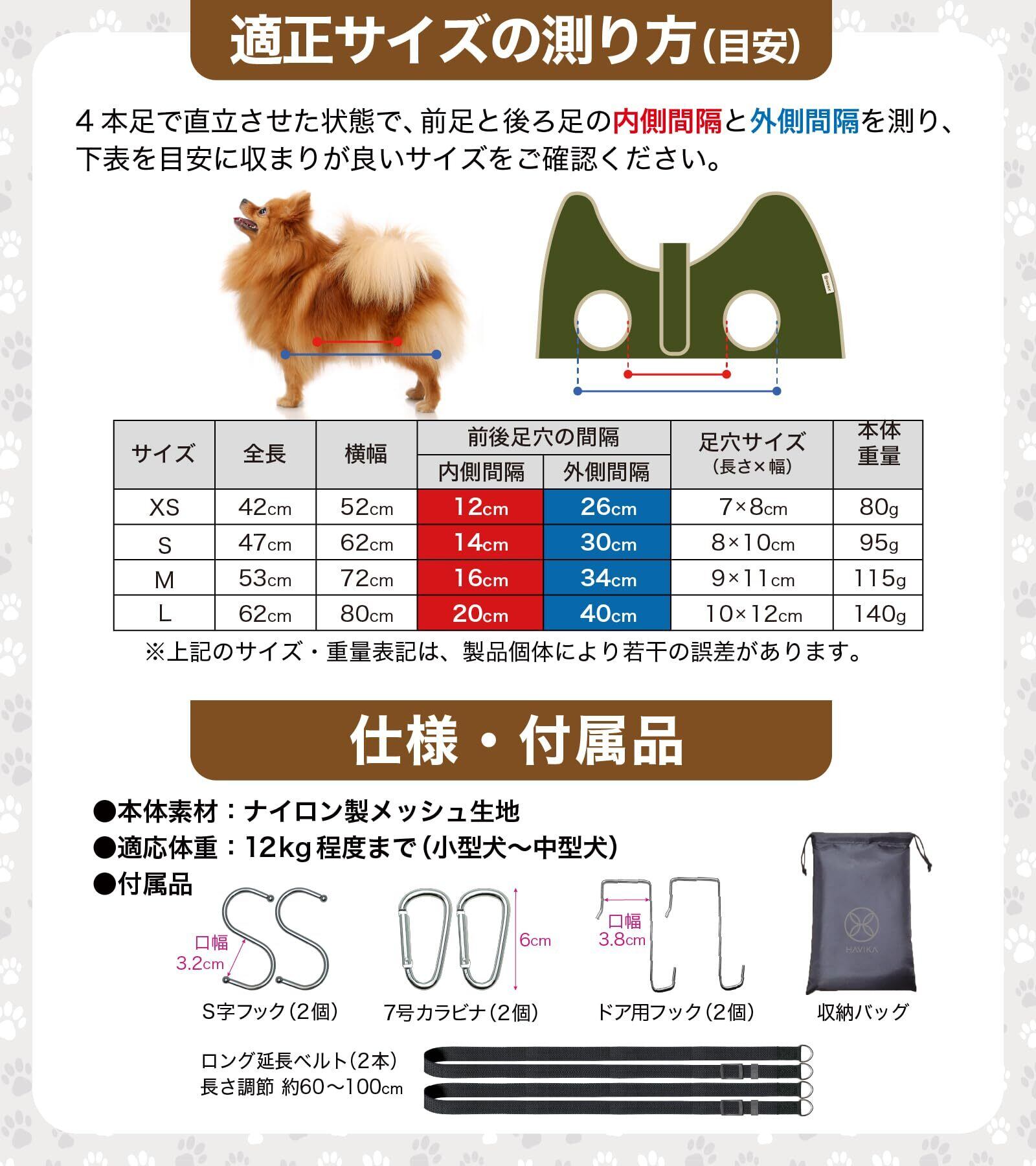 【仕様・付属品】◆本体素材:ナイロン製メッシュ生地 ◆適応体重:12kg程度まで(小型犬~中型犬) ◆付属品:日本語取扱説明書、S字フック2個、7号カラビナ2個、ドア用フック2個、ロング延長ベルト2本(長さ調節約60~100cm)、収納バッグ