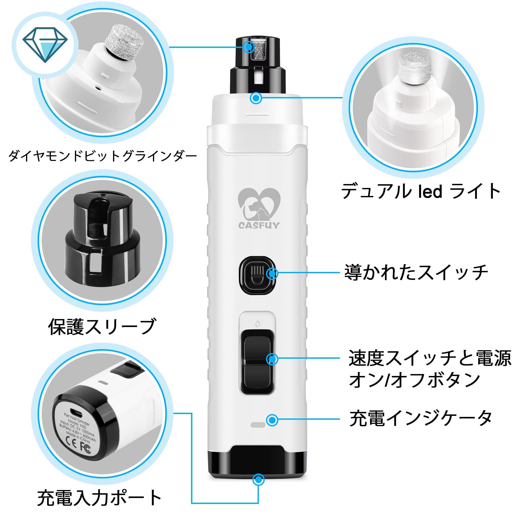 Casfuy 大型中型犬用の2つのLEDライトを備えた犬の爪切り-3倍強力な2スピード電気ペットの爪切り充電式静かな痛みのない足グルーミング&スムージングツール(ホワイト)