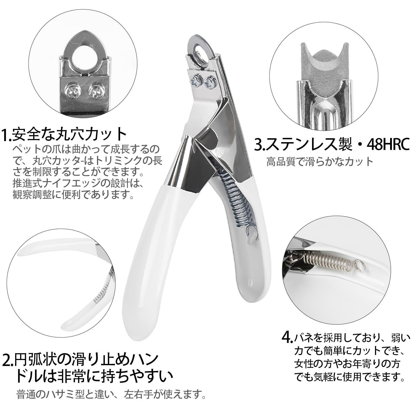 ステンレス製:爪切りは硬度48HRCのステンレス製で、鋭く切りやすいです。爪切りの時間を短縮し、ペットのストレスを軽減します。