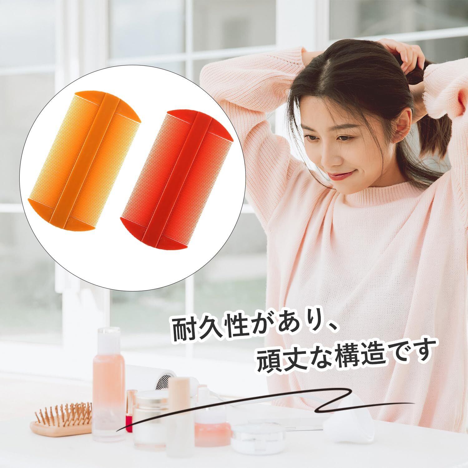 【使用方法】まず、普通のコームで髪の結び目をなめらかにしてから、髪を細かく分け、この両面コームで根元から毛先までとかします。 注意:コームの歯が細かいため、とかすたびに少量の髪を取る必要があります。
