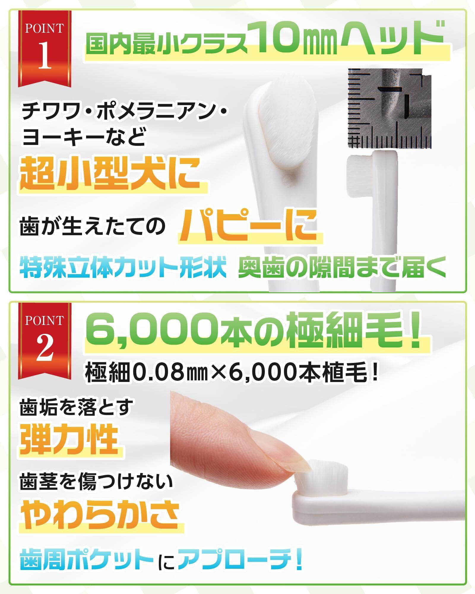 【国内最小クラスヘッド】ヘッドは驚きの長さ10㎜!特殊立体カット形状で、奥歯の隙間まで届きます。チワワ、ポメラニアン、ヨーキー、歯が生えたてのハピーに。