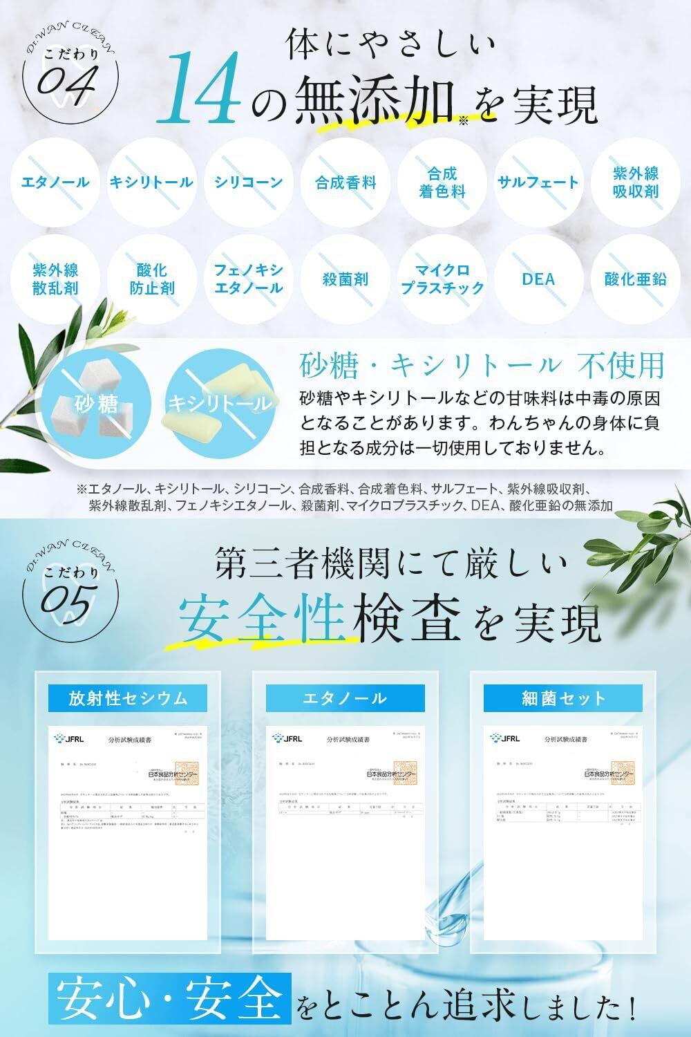 【品質へのこだわり】わんちゃんに負担をかけないため、徹底的にこだわった結果、無添加や人が口にしても問題ない基準のヒューマングレードを取得。また安全性検査も行い、安心してご使用いただけるようにこだわり抜きました。