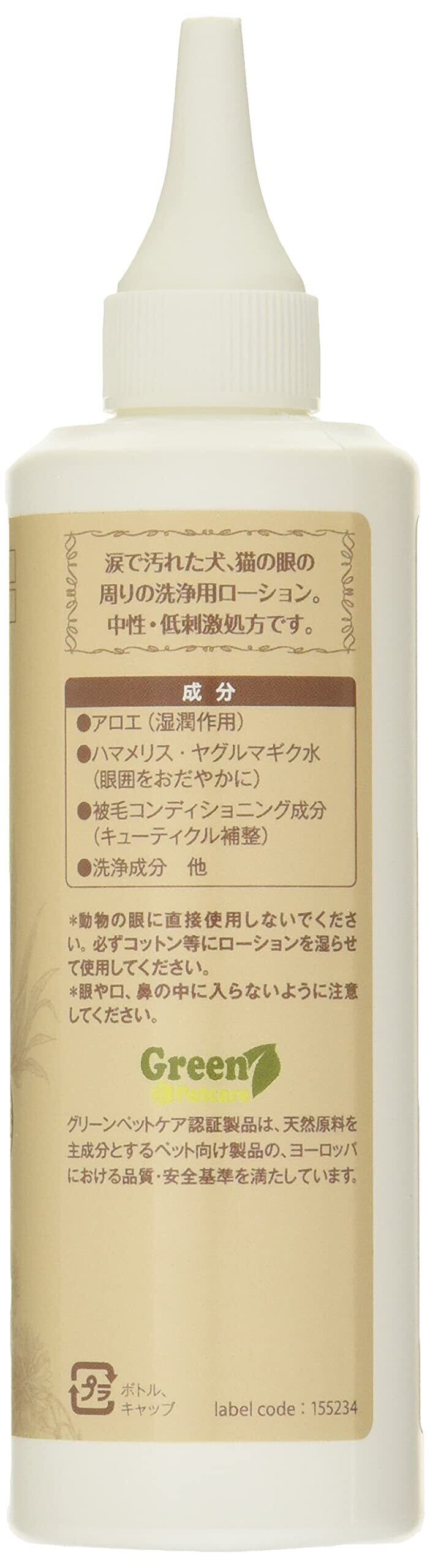 涙で汚れた動物の眼の周りを洗浄し、涙やけによる悪臭を緩和する洗浄ローションです。天然原料を主成分とするペット向け製品の認証団体である「Green Pet Care」の厳しい基準に従って開発されました。 涙液による油っぽい汚れを洗い落とすため、糖質由来の洗浄成分に保湿作用のあるアロエ抽出物等を配合し洗浄効果が向上するように設計されています。また、被毛のコンディショニング成分等を配合することでキューティクルを整え、赤身も除去。さらに人間の基礎化粧品にも使用されている高品質なハマメリス水とヤグルマギク花水を配合することで眼の周囲の皮膚を穏やかに落ち着けて保護する作用があります。 誤って眼の中へ⼊ってしまった場合でも無刺激*で安全性が⾼い製品です。