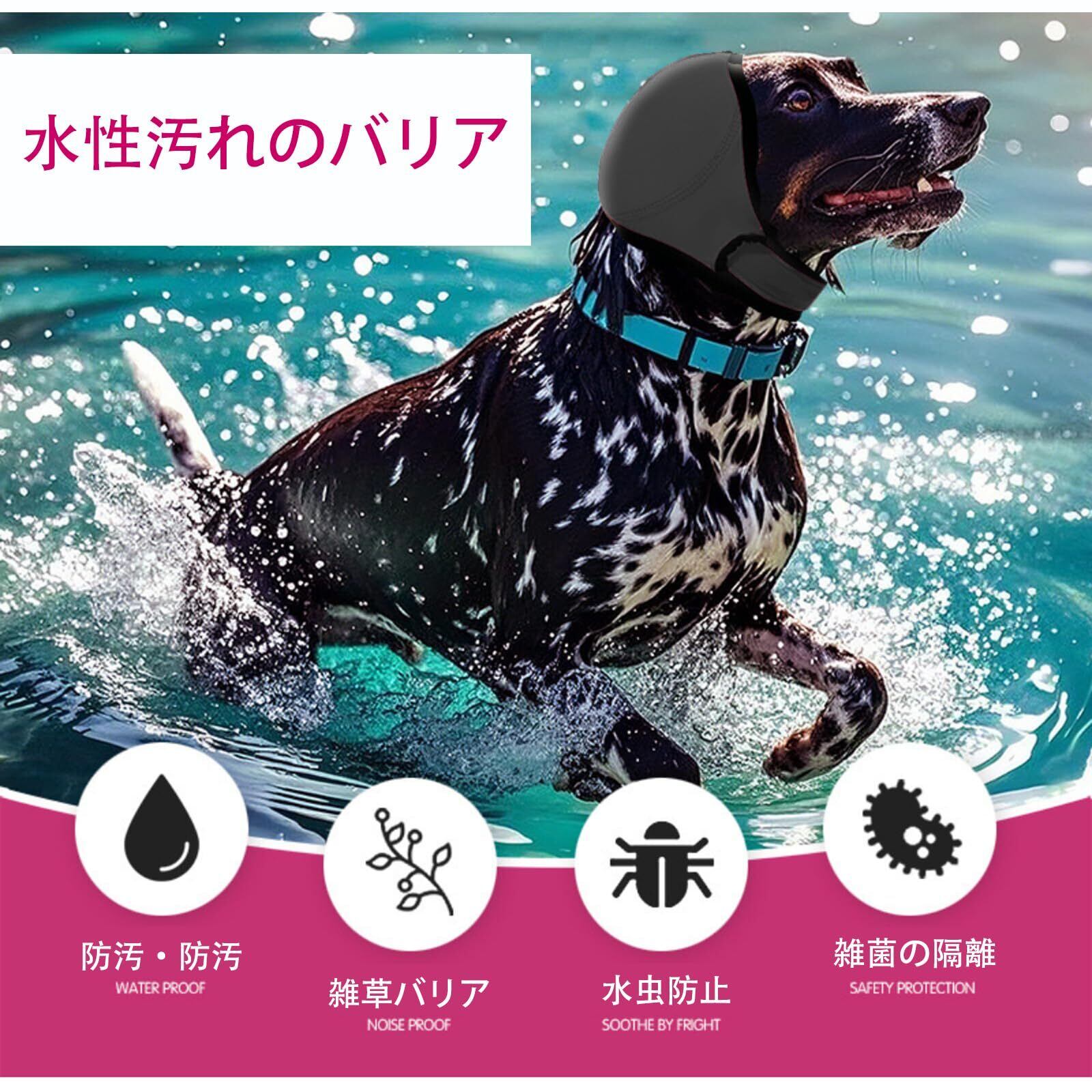 「多機能プロテクション」 プール時の水垢侵入防止から、ほこりの多い道の散歩まで。耳ダニ予防やアレルギー対策にも役立つ防塵機能付き。