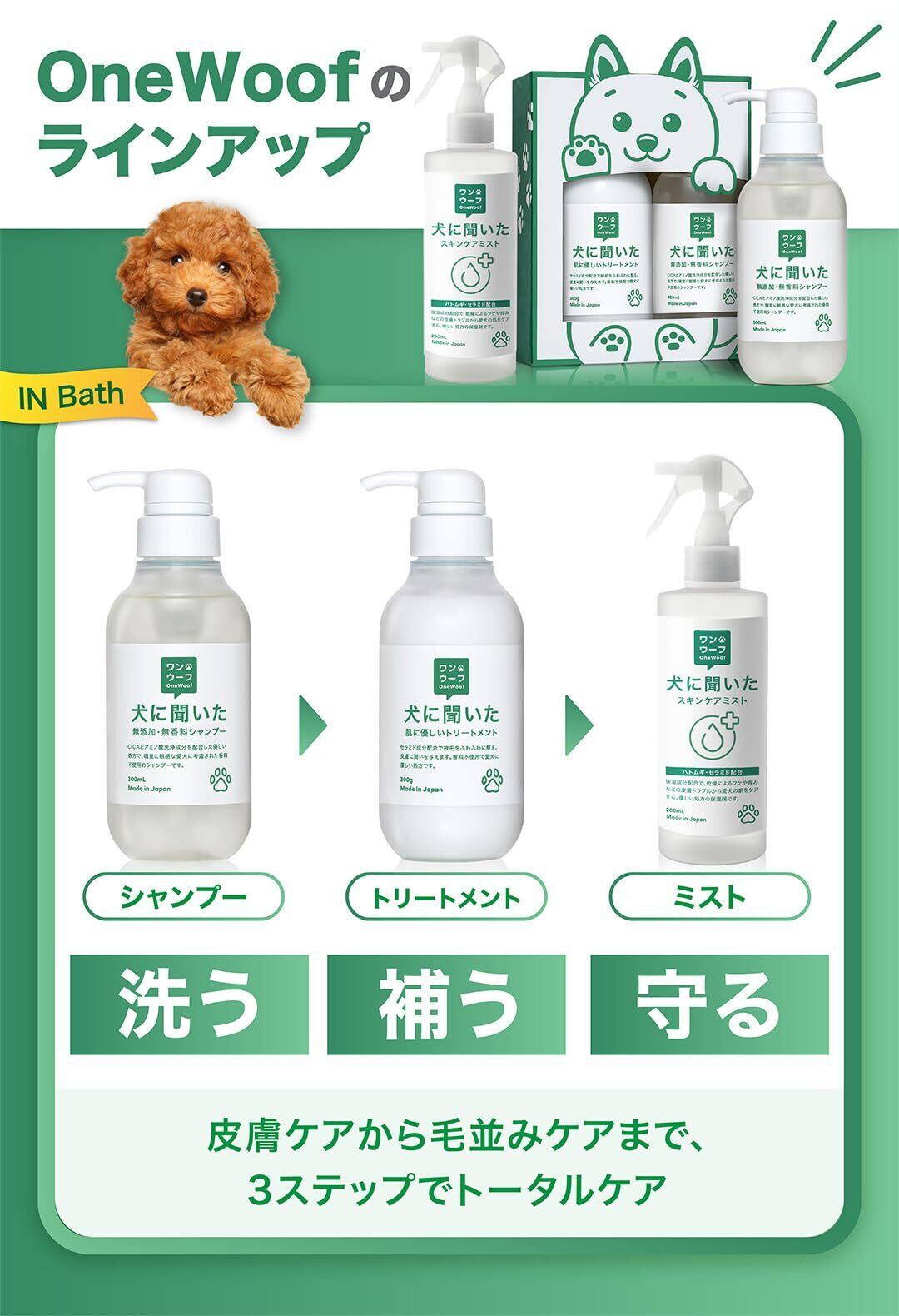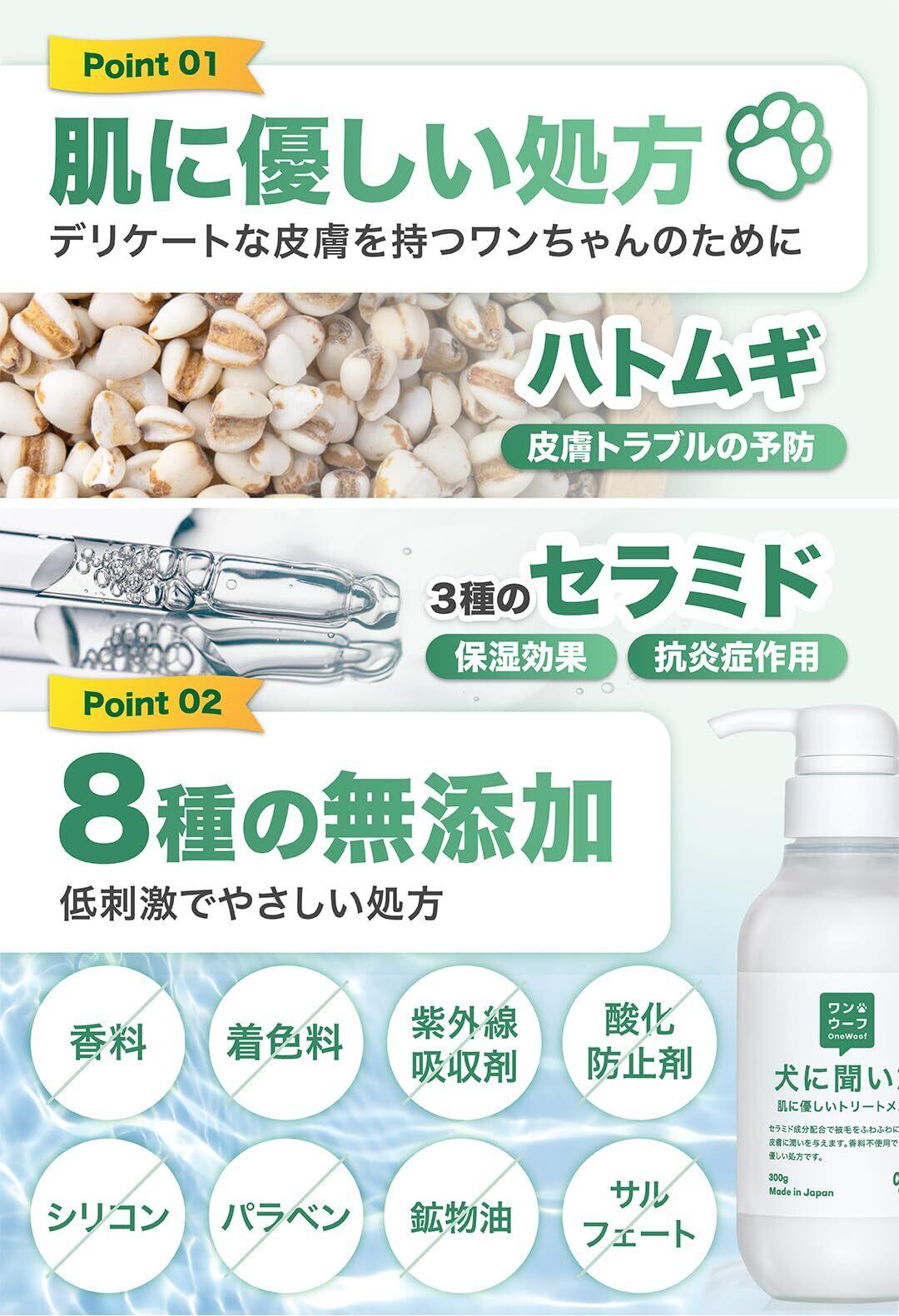 【 犬に聞いた 肌に優しい トリートメント 】獣医師×トリマー監修 低刺激 犬用 猫用 オーガニックトリートメント ハトムギ セラミド 配合 毛玉予防 被毛ケア 日本製 (1本) OneWoof ワンウーフ