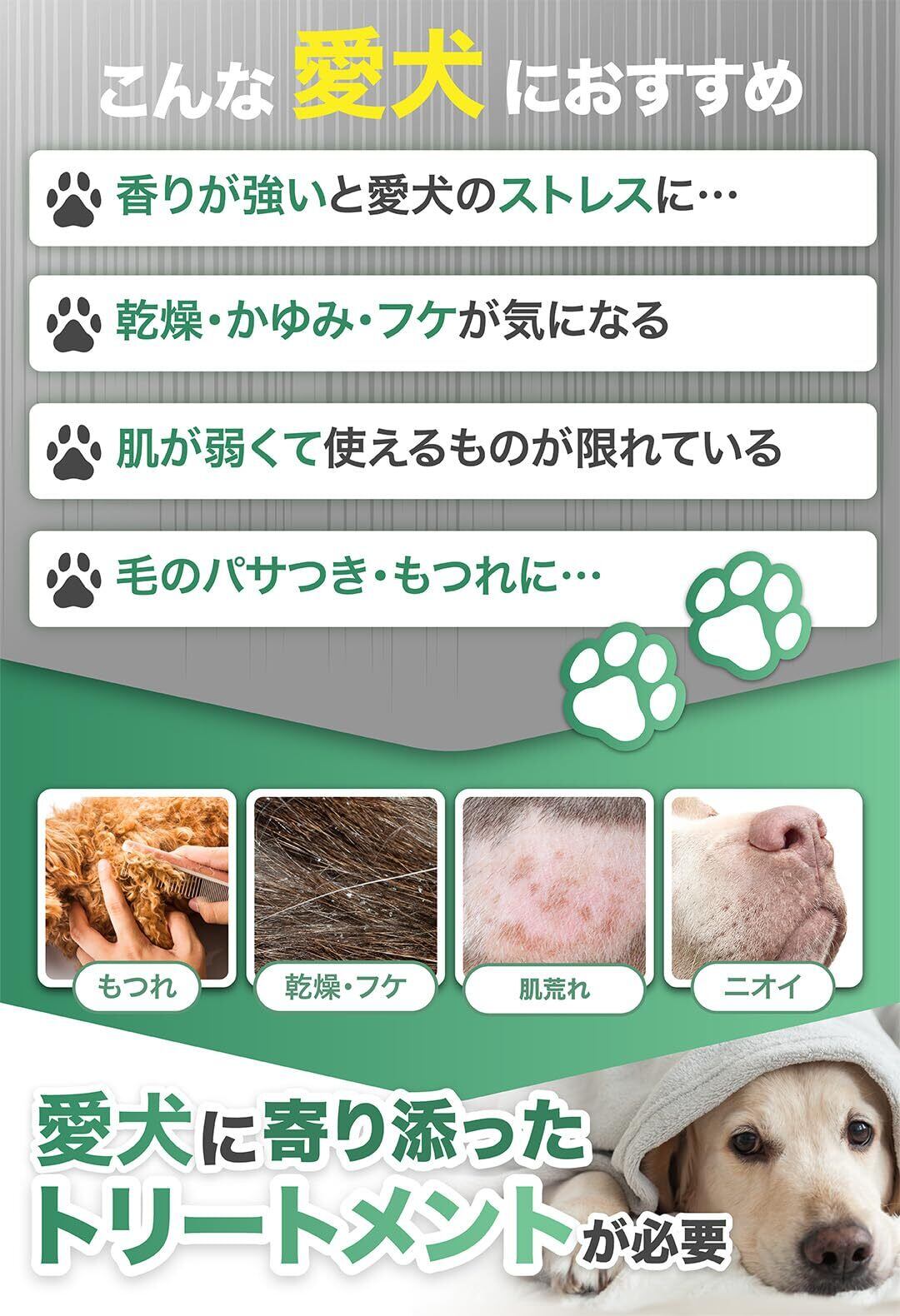 商品特長 無香料で犬の嗅覚に負担をかけず、乾燥やかゆみ、フケ、毛のもつれといった日常的なお悩みに寄り添います。, 獣医師監修のもと開発された低刺激で肌に優しい犬用トリートメントです。