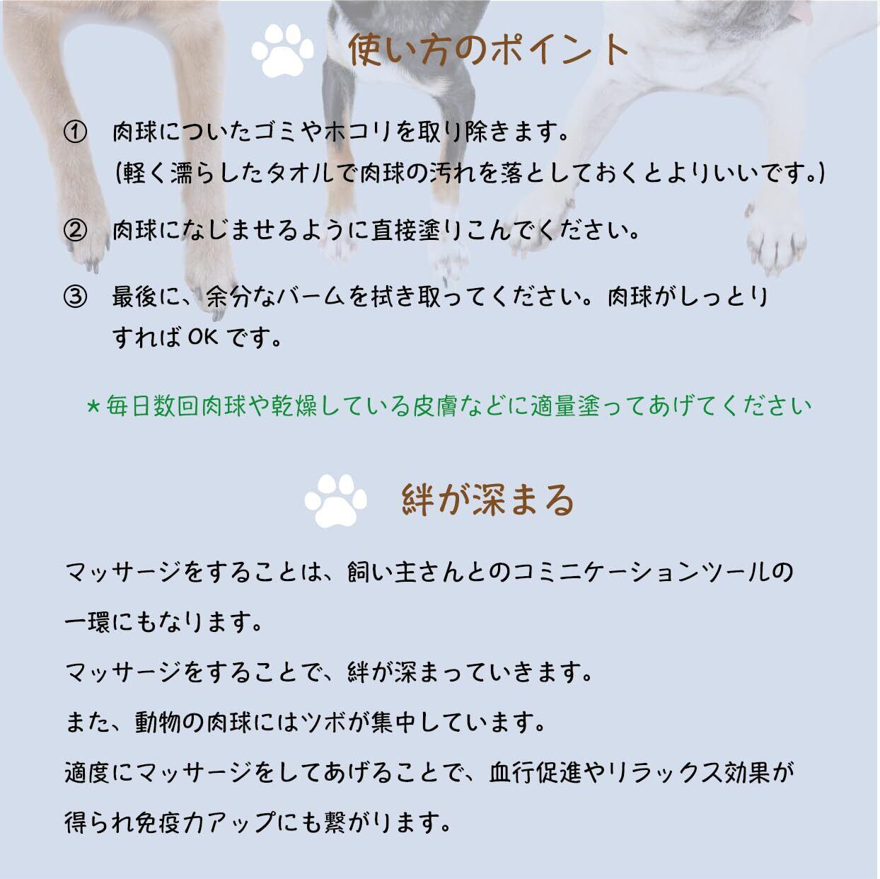 【使用用途】肉球のケアはもちろん皮膚の健康維持や虫刺されなどにも使えます。