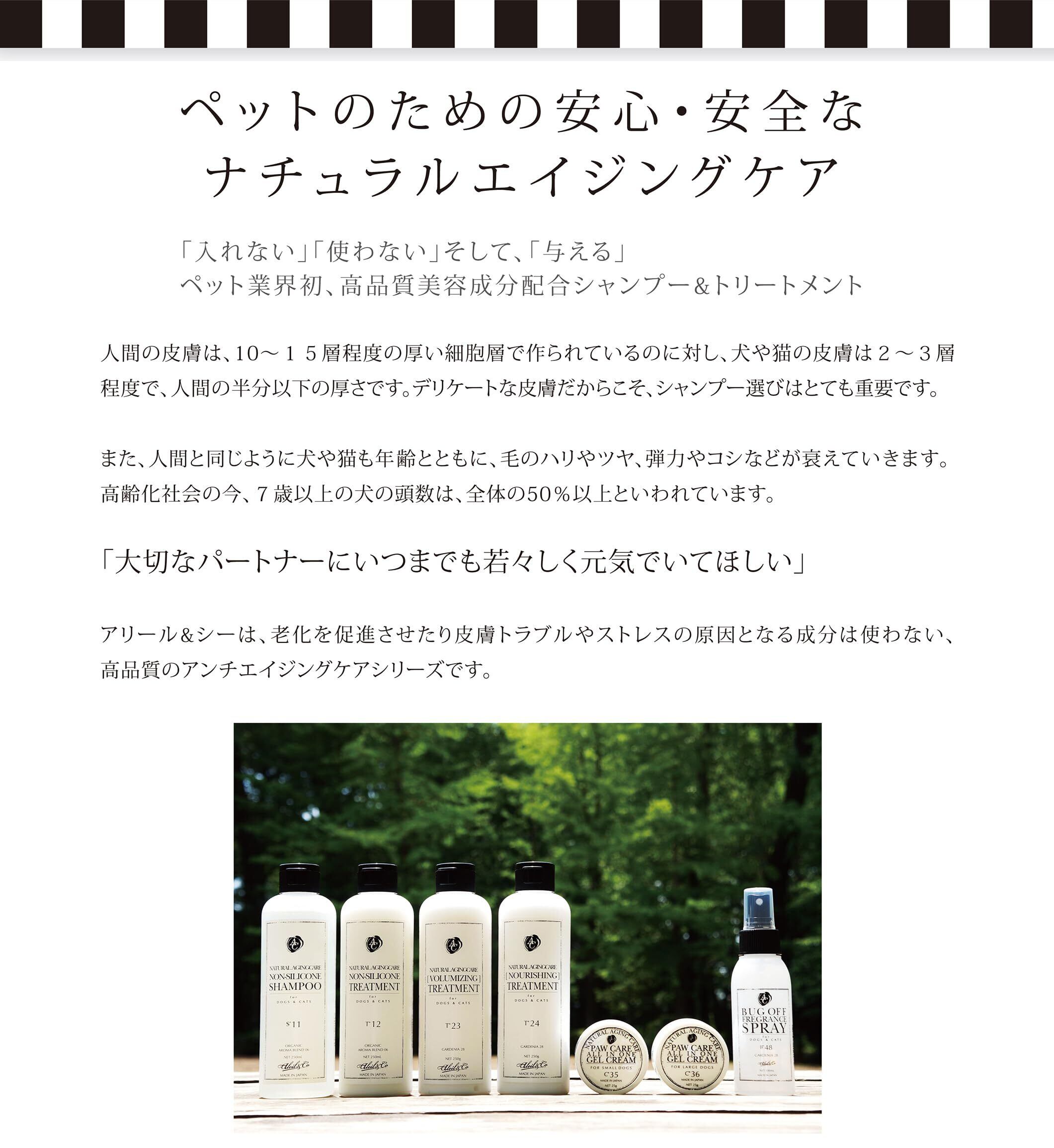 [Natural Aging Care Series]ナチュラルエイジングケア(全犬種・全猫種対応)ナリッシングトリートメント(しっとりなめらかツヤ感アップ)T24 200ml 最新の動物スキンケア医学に基づき開発された、アリール&シー製品の安心・安全・高品質なエイジングケアシリーズのナリッシングトリートメント! ツヤと潤いのある、しっとりとした仕上がりに。手触りもなめらかで、もつれ・絡みを防止、ブラッシング時の静電気も防ぎます。甘くやわらかなガーデニアの香り。 【おすすめの犬種】ダックスフンド・ヨークシャテリア・シーズー・キャバリア・コッカースパニエル・・アフガンハウンド等、ロングコート用としておすすめです。 天然成分配合・紫外線吸収剤フリー ・石油系界面活性剤フリー・ラウリル硫酸ナトリウムフリー・PEGフリー・無鉱物油・無着色です。 【使用方法】被毛のダメージやお好みの仕上がりに合わせて原液~5倍まで希釈して使用可能。シャンプー後適量を手に取り、優しくマッサージするように被毛全体になじませ数分おいてから、地肌まで十分に洗い流してください。被毛のダメージやお好みの仕上がりに合わせて原液~5倍まで希釈して使用できます。特に毛玉の出来やすい箇所やダメージの気になるところにたっぷりなじませてください。特に毛玉の出来やすい箇所やダメージの気になるところにたっぷりなじませてください。 【全成分】水、イソノナン酸イソトリデシル、グリセリン、BG、プロパンジオール、セテアリルアルコール、カプリリルグリコール、トコフェロール、グリチルリチン酸2K、ジメチコン、アモジメチコン、ステアルトリモニウムクロリド、イソプロパノール、ステアルジオニウムヒドロキシプロピル加水分解ケラチン、ベヘントリモニウムクロリド、エタノール、セタノール、(ジイソステアリン酸/水添ロジン酸)グリセリル、ポリクオタニウム-10、セテス-15、ジココジモニウムクロリド、クエン酸、フラーレン、プラセンタエキス、馬油、ヒアルロン酸Na、加水分解コラーゲン、オリゴペプチド-24、セラミドEOP、セラミドNP、セラミドAP、フィトスフィンゴシン、コレステロール、カルボマー、キサンタンガム、安息香酸、エチドロン酸、ラウロイルラクチレートNa、PVP、香料 【使用上の注意】目・耳・口などに入らないように注意してください。入った場合はよく洗い流してください。犬の皮膚に合わない場合はご使用をお止めください。使用後は必ずふたをして直射日光をさけて保管してください。極端に高温、または低温の場所で保管されますと変色や濁り等が生じることがありますが品質に問題はございません。乳幼児の手の届く場所には保管しないでください。天然成分配合の為、水道水などで希釈した場合はその日のうちに使い切ってください。