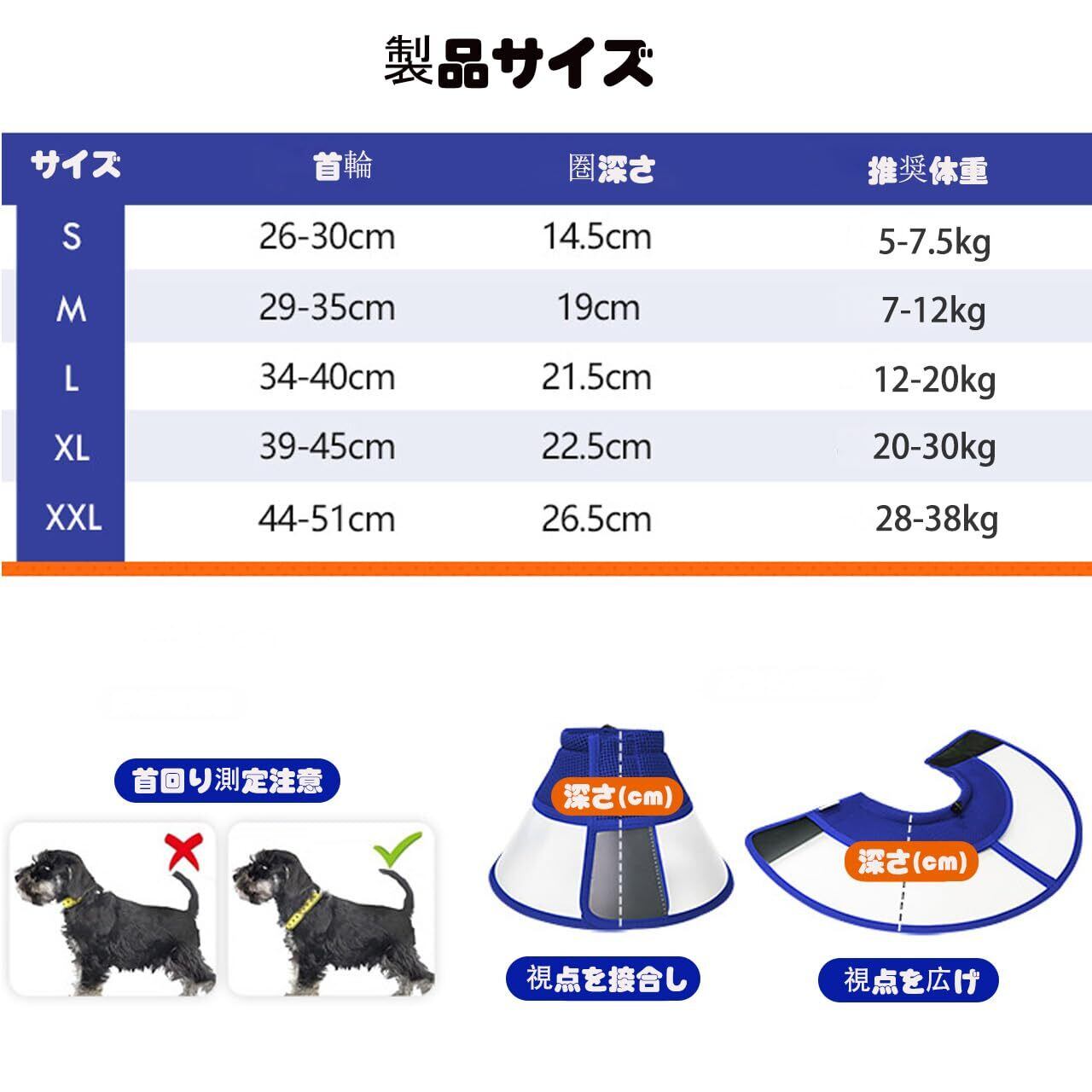 【サイズ利用可能】犬用エリザベスカラーはS~L三つのサイズ利用可能、首回り26~40cmの犬に適用しています。ほとんどの犬種に適用しますが、ご注文する前に、きちんと愛犬の首回りを測量して、サイズチャートに参照し、適当なサイズをお選びください。