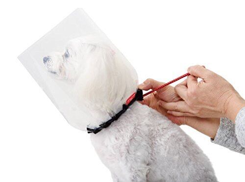 眼を保護しながら生活するための、わんちゃん用エリザベスカラーです。チューリップ型の形状が正面からの衝撃に強く、目の保護に適しています。さらに首部分が巾着になっているので、ワンタッチで調節も装着も可能です。