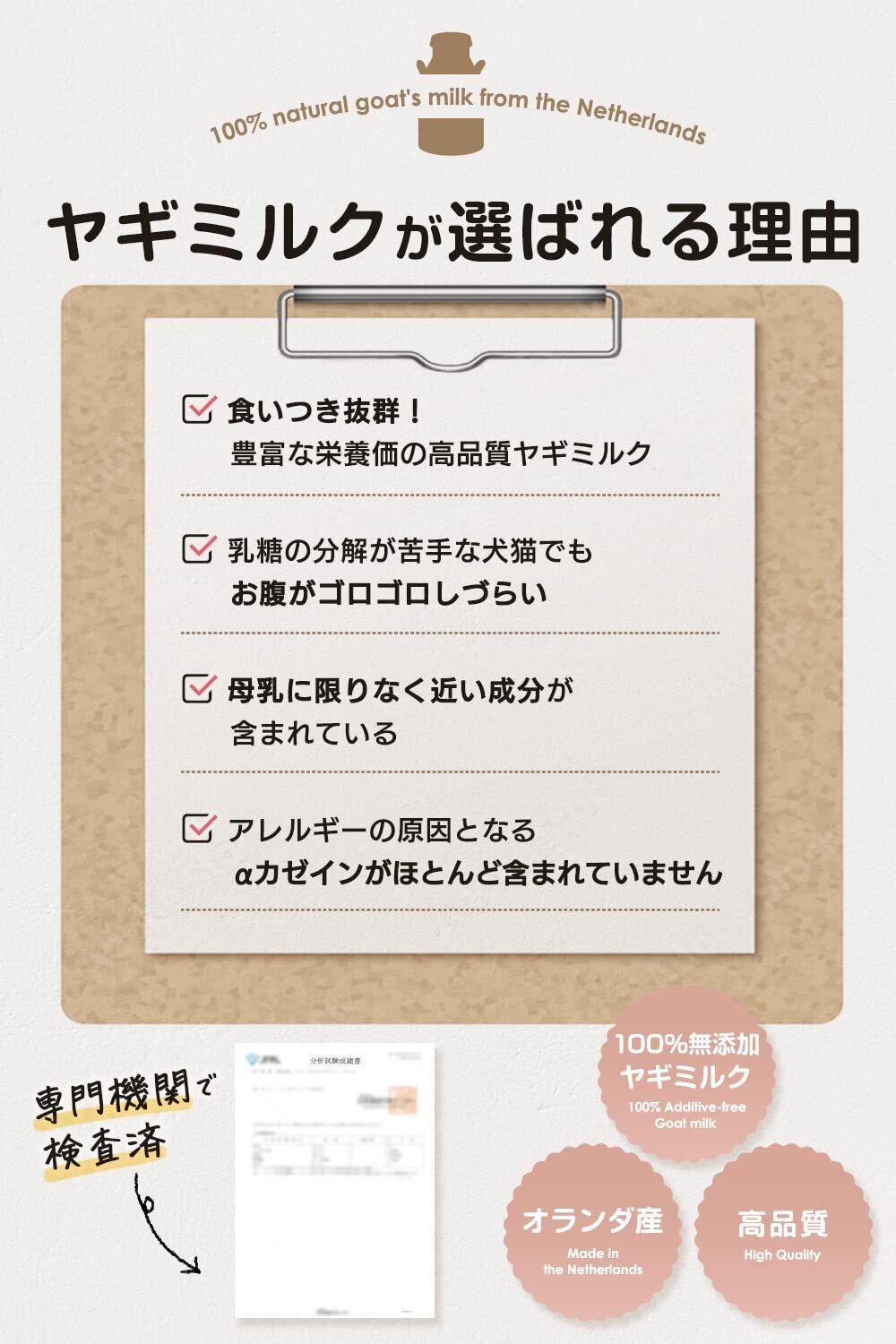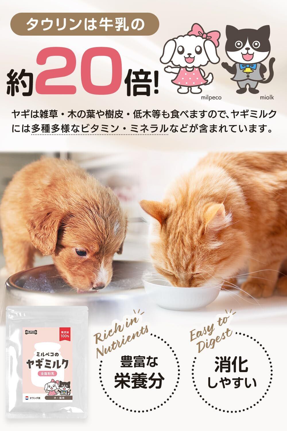 [ ミルペコ無添加ヤギミルク ] 無添加・無着色のオランダ産100%ヤギミルクです。全脂粉乳の豊富な栄養価の高品質ヤギミルクなので、犬、猫、小動物などで食いつき抜群です。山羊ミルクは牛乳よりタウリンが約20倍。ヤギは雑草・木の葉や樹皮・低木等も食べますので、やぎミルクには多種多様なビタミン・ミネラルなどが含まれています。山羊の乳は牛乳と比べ栄養価が高く、脂肪球が6分の1と少なく消化しやすいです。母乳に近い成分のため、乳糖の分解が苦手な犬猫でも与えることができます。また、お腹がゴロゴロしづらいのが特徴です。約7.5倍のぬるま湯 ( 水 ) に溶かして与えたり、フードに直接ふりかけて与えたりすることもできます。( 犬、猫、小動物で、そのコごとに合う合わないがありますので、様子を見ながら少量ずつお与えください。)