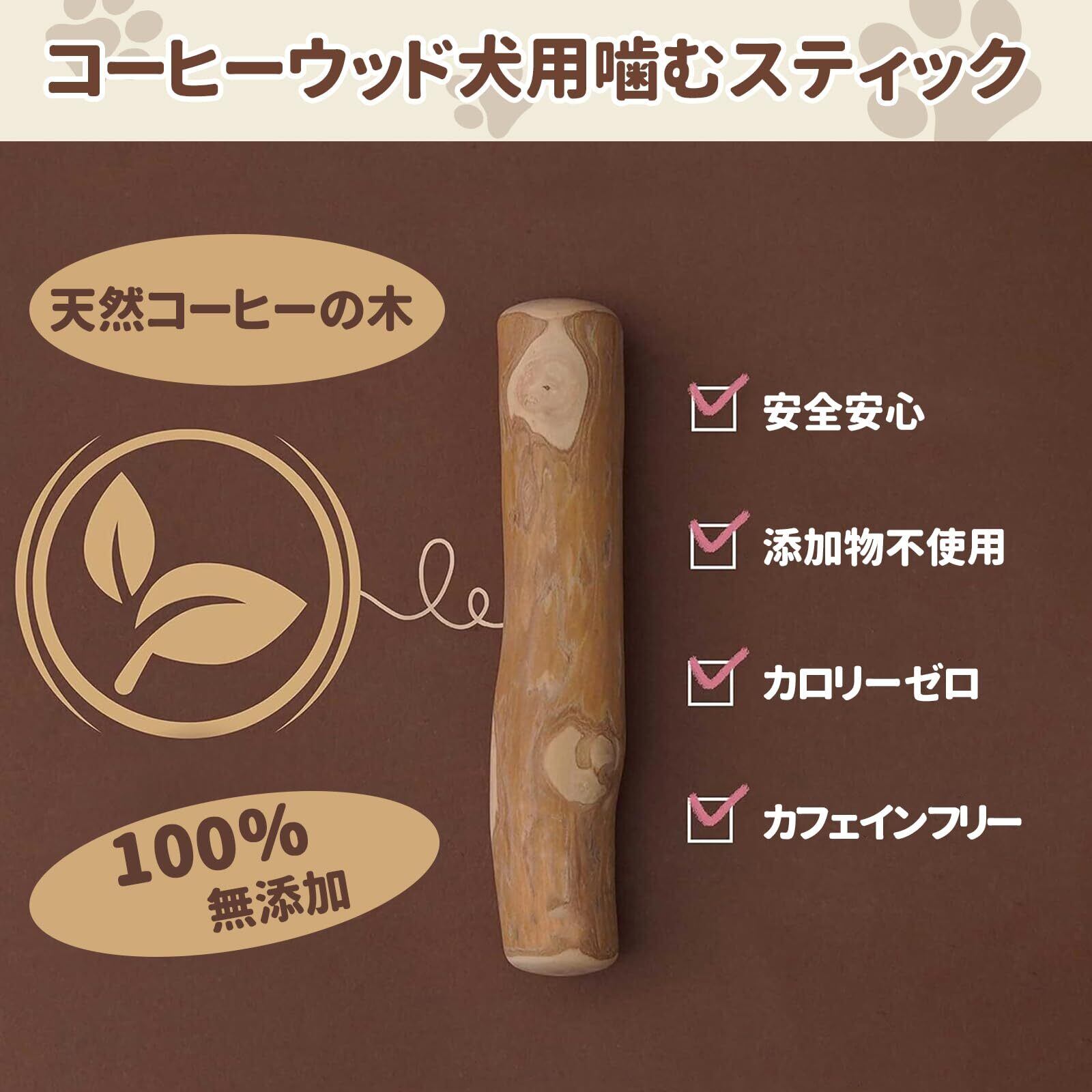 【完全無添加、天然素材の安心感】当社製品は添加物を一切使用せず、100% コーヒーの木を原料としています。原料の表面はやすりで軽く処理するだけで、コーティングなども施されておらず、カフェインも含まれていません。最も素の原料をそのまま使用しており、100% ナチュラルな安心のおやつです。