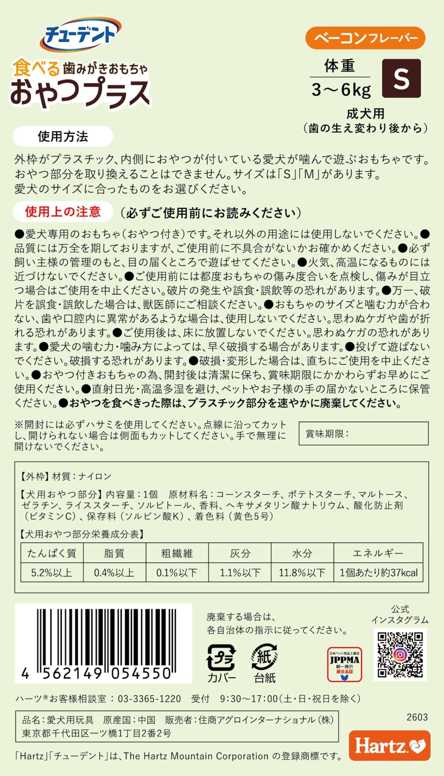 チューデント 食べる歯みがきおもちゃ おやつプラス S 超小型~小型犬 ベーコンフレーバー ×2個 ハーツ(Hartz) 犬用おもちゃ 犬用玩具 歯磨き おやつ デンタルケア