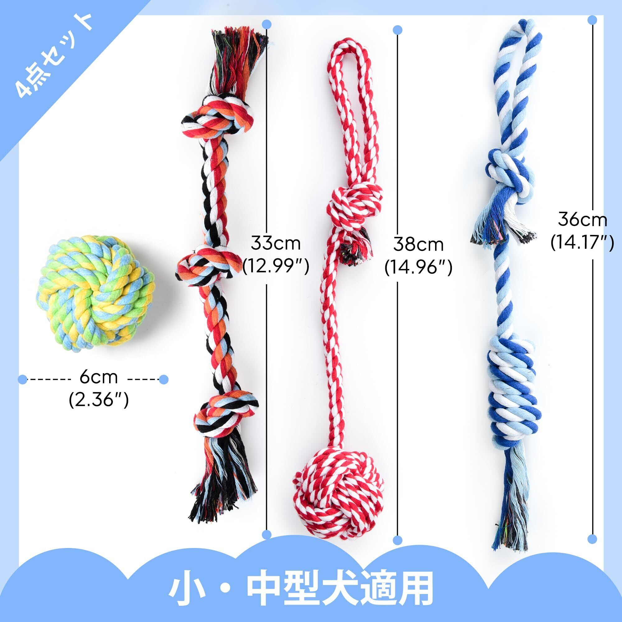 【4個セット多様な遊び方】4種類の異なる形状の犬のおもちゃのセット!犬おもちゃ頑丈噛むなど、投げる、奪う、ひっぱりっこ、多様な遊び方が可能です。犬ロープおもちゃインタラクティブなおもちゃとしても最適で、あなたと犬の絆を強化します。犬おもちゃセット壊れないは犬の興味を引き出し、長時間遊んでも飽きることがありません。小型犬から中型犬まで幅広い犬種に適しており。