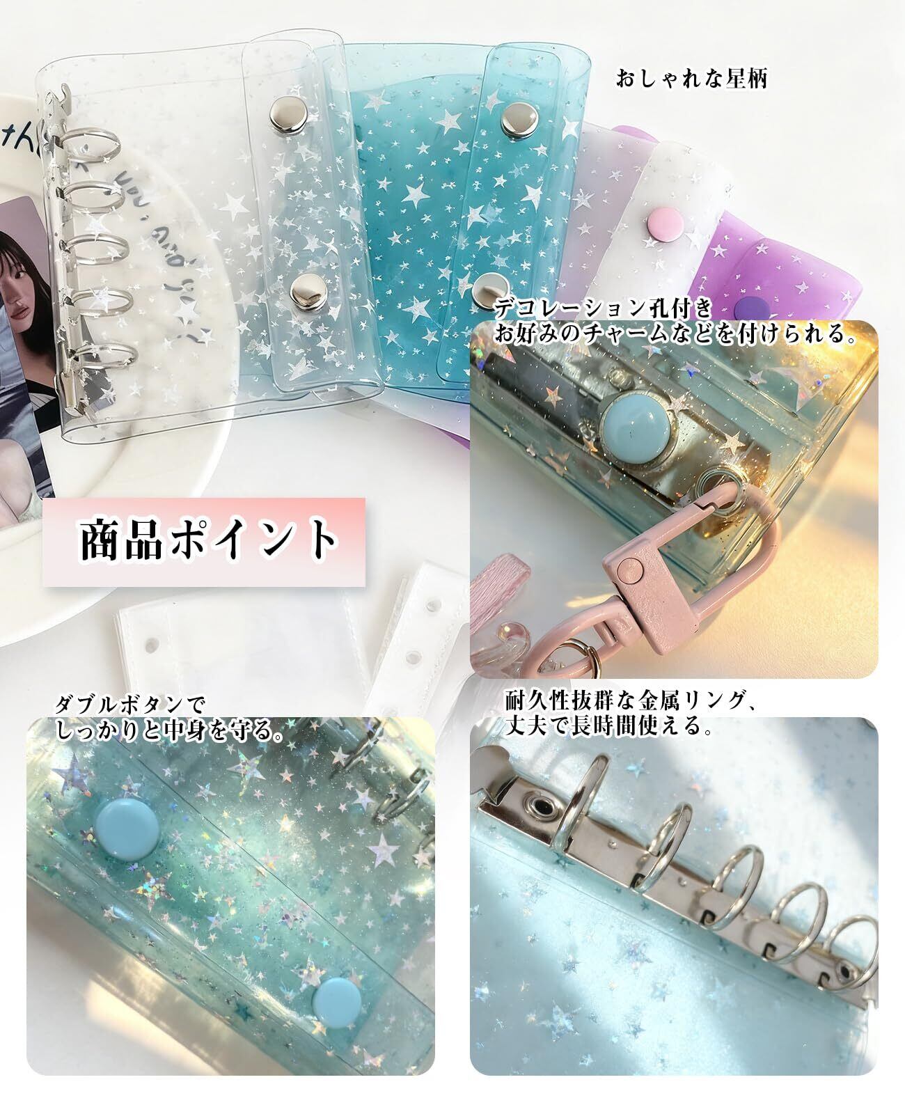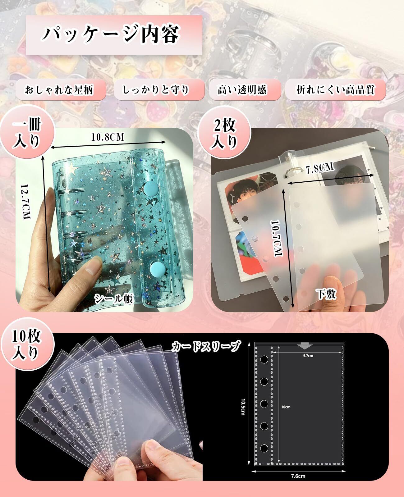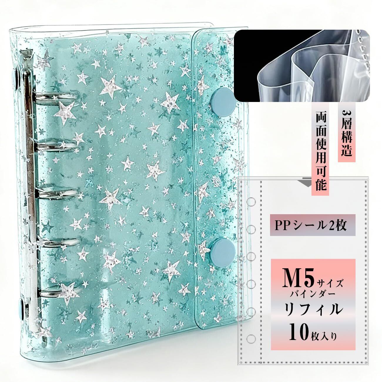 シール帳 透明 M5サイズ バインダー 星柄 手帳クリア はがせる 女の子 5穴 3層構造 【PPシール2枚+フィルム10枚セット】 貼る 飾る 収納 推し活グッズ ブルー