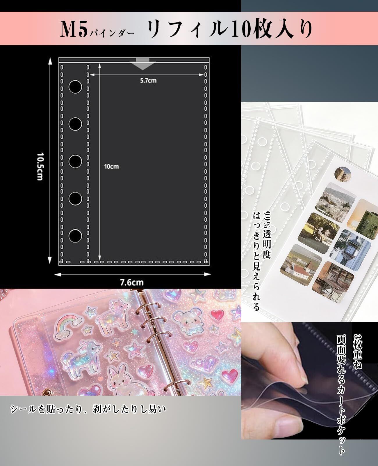 【マルチな使い方】「貼る・飾る・収納・記録」、一冊多役の便利さが魅力な多役のM5サイズのシールバインダーです。お気に入りのシールを収納するだけでなく、発想やto doリストなどを記録する為の日記帳やスケジュール帳としてもご活用いただけます。おしゃれな星柄入る透明のクリアカバーは、デコレーションのキャンバス。お好みのシールやマスキングテープで飾って、世界に一つのオリジナル手帳をお作りください。