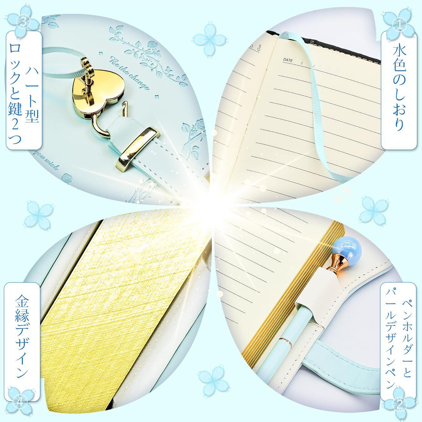 【数量限定】鍵付きノート 女の子 可愛い 鍵付き手帳 日記帳 鍵付き 日記 b6 ノート 詰め替え可能 横罫 子供 小学生 女の子 プレゼント 鍵付き日記帳 PUレザー 女性用 学生 メモ帳 ジャーナル 文房具 記念日 誕生日 プレゼント (水色ガーデン)