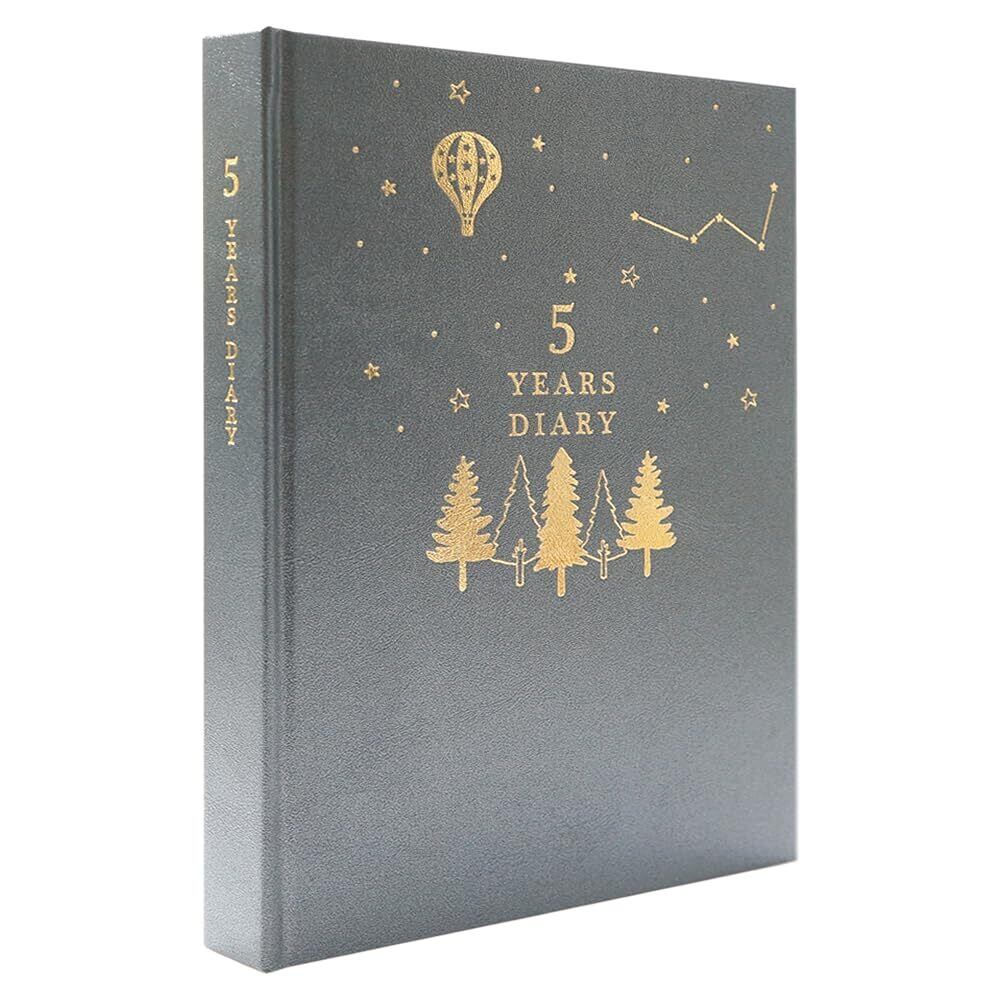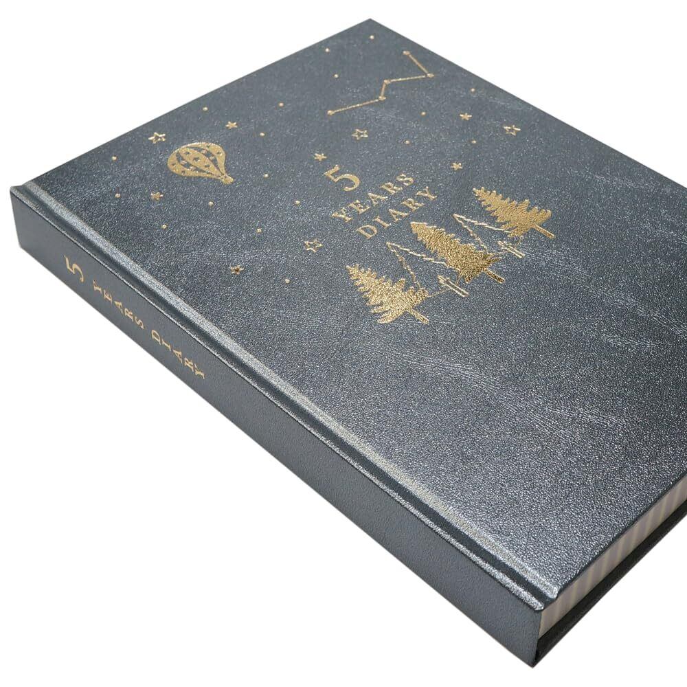 森と星空をモチーフにした優雅なデザインの5年連用日記です。A5サイズ(154×215mm*厚み23mm)で、金箔加工が施された表紙と背表紙が高級感を演出します。368ページの本文には、1ページに同じ日付の5年分の記録が書き込めるフリータイプ設計。1日4行のシンプルなレイアウトで、毎日の出来事や思い出を無理なく続けることができます。クリーム色の上質な書籍紙を使用し、目に優しく書き心地も滑らかです。過去の記録を振り返ることで、その日の気づきや成長を実感できる貴重な一冊に。しおりひも付きで使いやすく、プライベートな日記としてもビジネスの記録用としても最適です。585gの程よい重量感と、しっかりとしたハードカバーで長く大切に使える日記帳です。大切な方への贈り物としてもおすすめです。