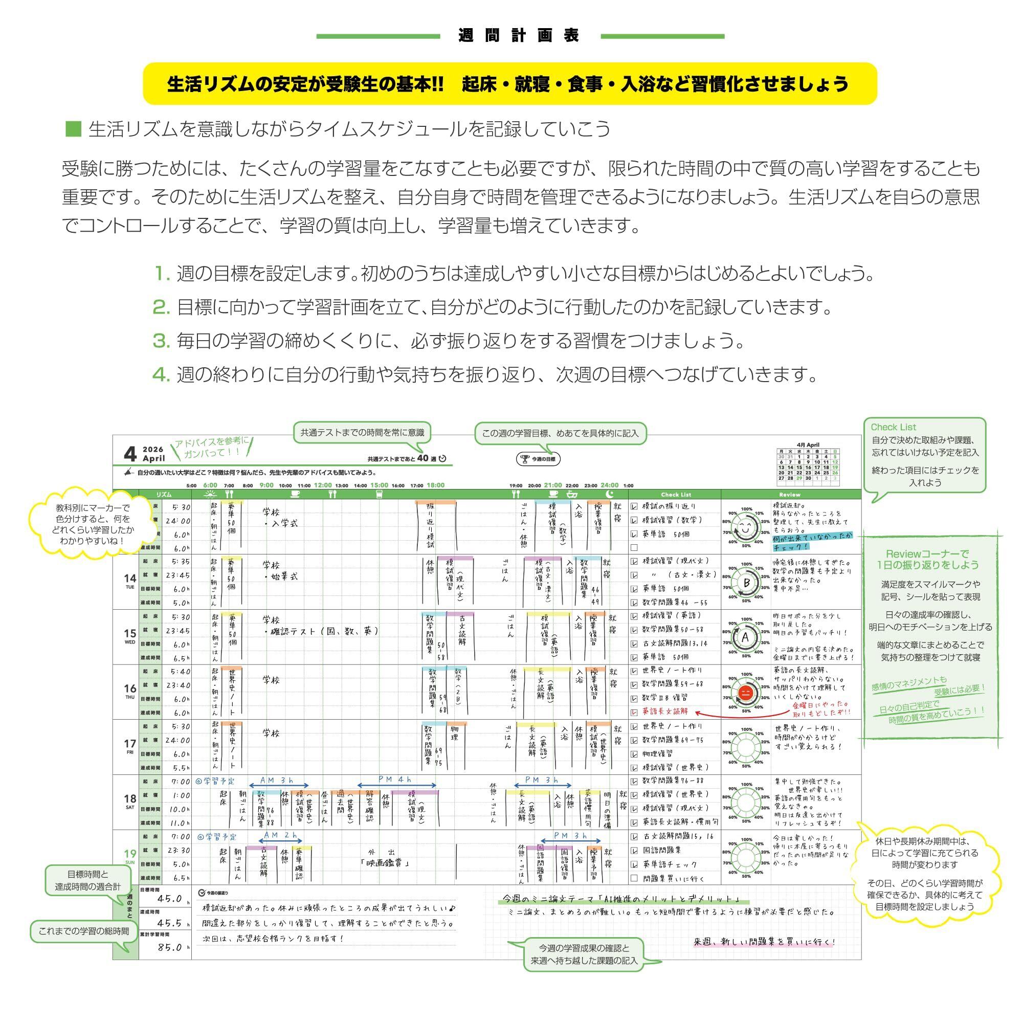 週間・月間ページには共通テストまでのカウントダウンを記載。本番までの時間を常に意識しながら学習計画を立てられます。