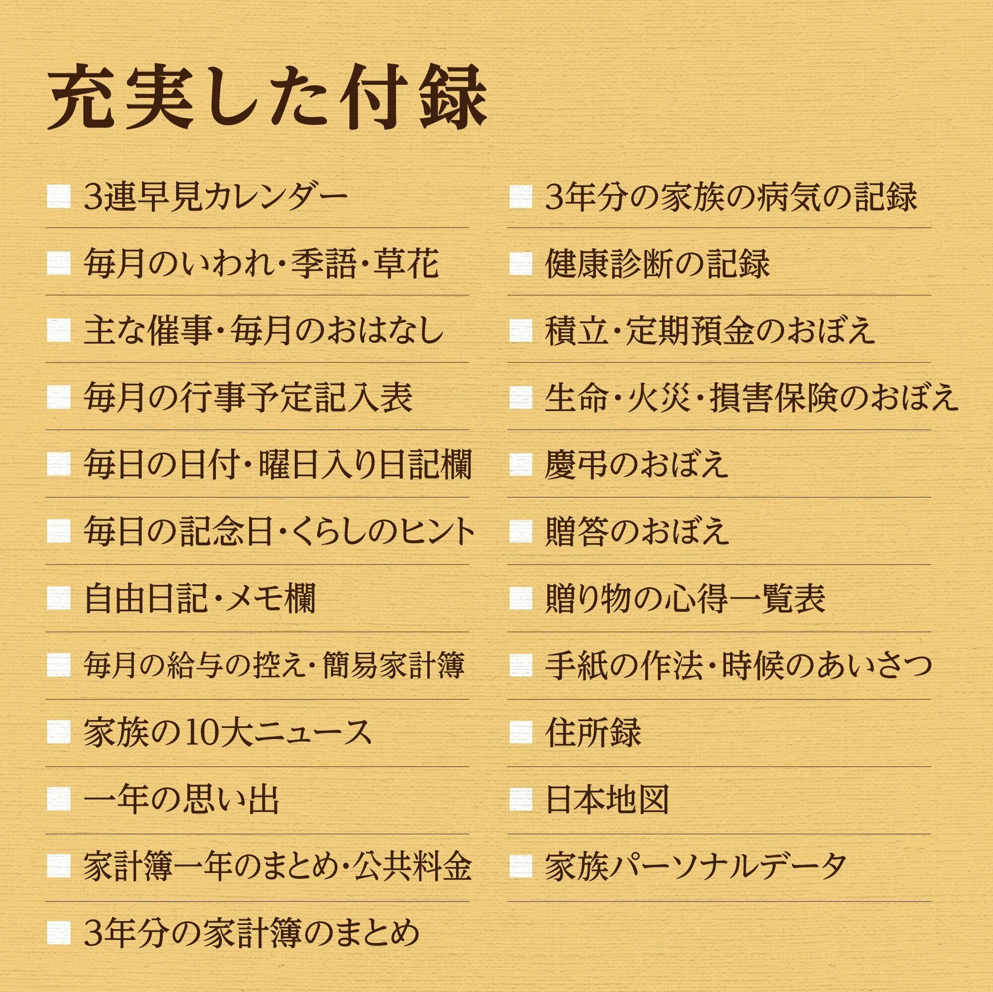 日記の記入以外にも家計簿、健康の記録、住所録等々、機能満載!くらしのヒントや手紙の作法等、便利な情報も盛りだくさん!