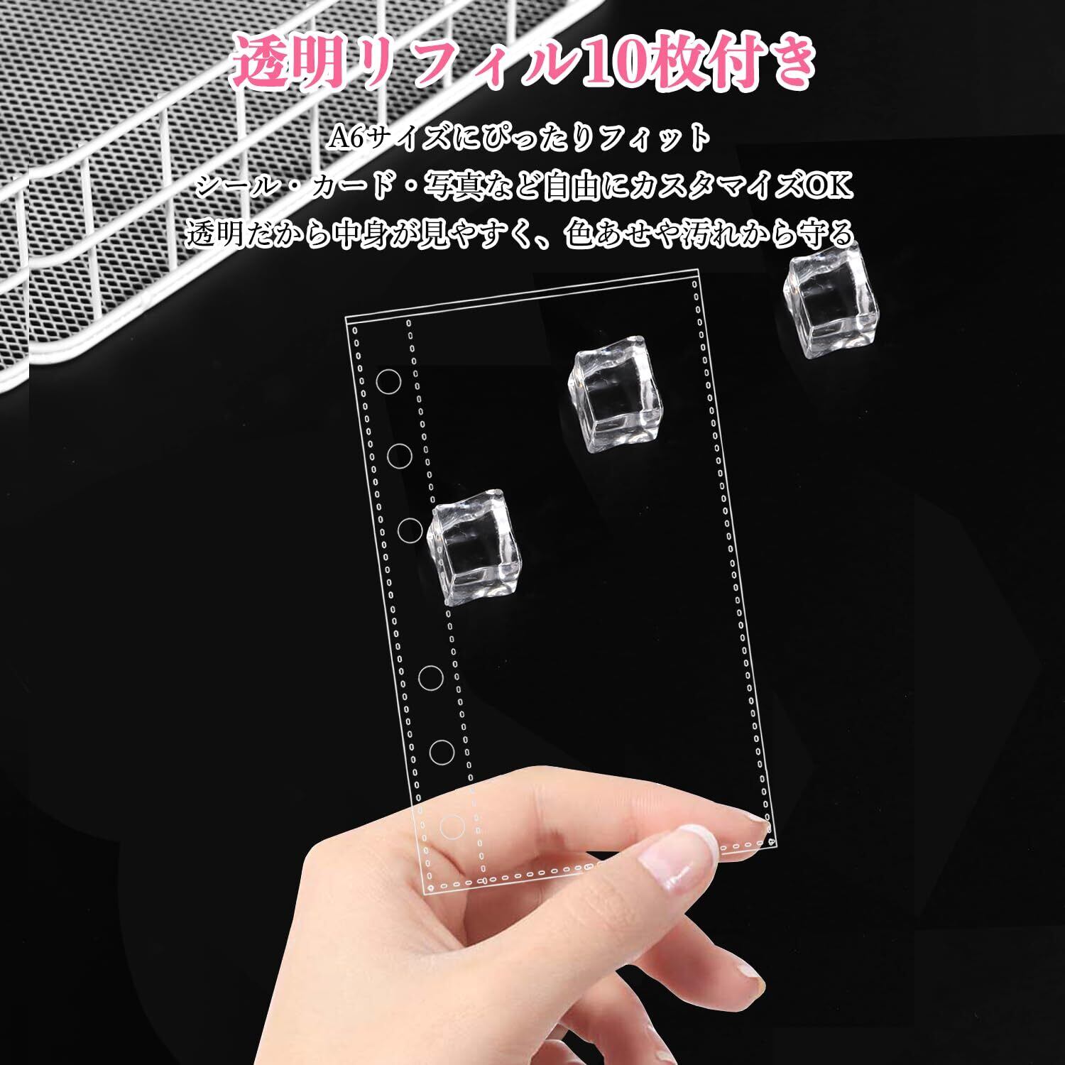 【A6サイズ&6穴対応で使いやすい】外寸:10.6×16.5cm、内寸:8.8×16cmのA6サイズ仕様。6穴タイプなので、市販のA6サイズ手帳やシールバインダーにしっかり対応します。今お持ちのバインダーに追加して使えるので、拡張性も高く、シールコレクションを整理しながら楽しむことができます