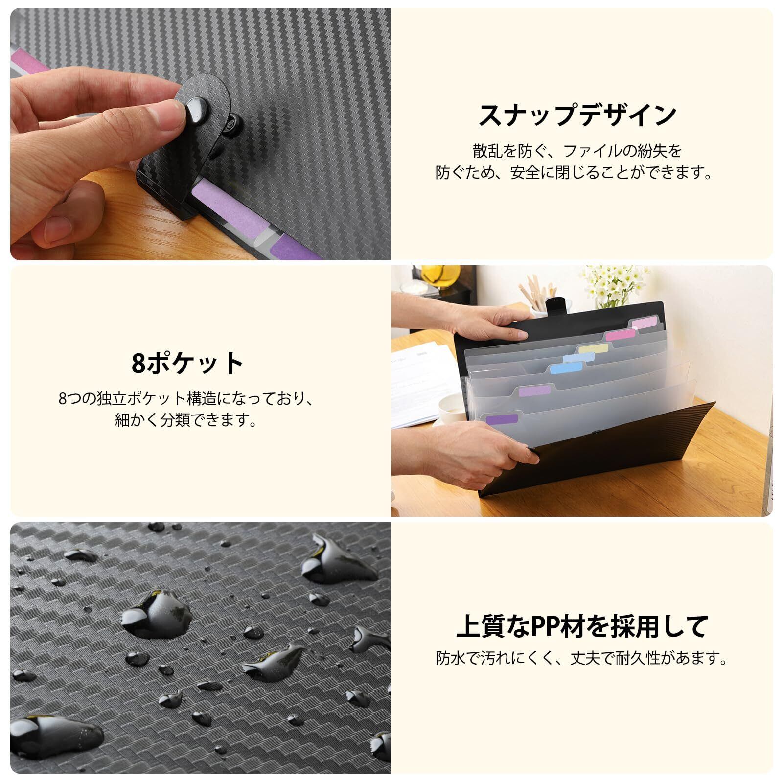 【分類便利】8つの独立ポケット構造になっており、様々な書類を細かく分類できます、インデックスタブ付き、必要な書類を簡単に素早く見つけることができます。書類の整理及び収納はもっと便利です。