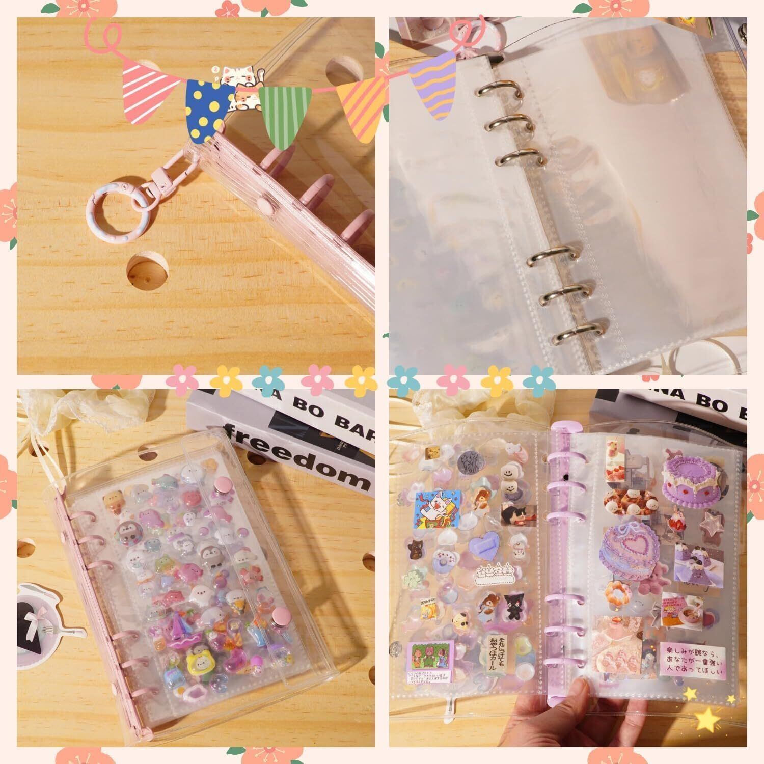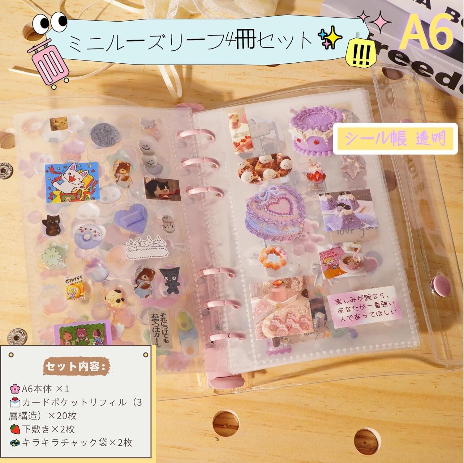 【A6サイズのミニシール帳バインダー】 セット内容:①バインダー本体 ②カードポケットリフィル(3層構造/プラスチックシート)×20枚③下敷き×2枚④チャック付きポケット×2枚。内寸約8.8cm×16cmのカードスリーブで、トレカや写真をしっかり収納。 リフィル付きの透明ミニバインダーは、小学生の女の子にも使いやすいコンパクトサイズ。本体サイズ(約):縦19cm×横12cm×厚み2.5cm。持ち運びやすいサイズ感で、デコや推し活用にもぴったりなシール帳バインダーです。※紙のリフィルは付属していません。※シールは別売りです。