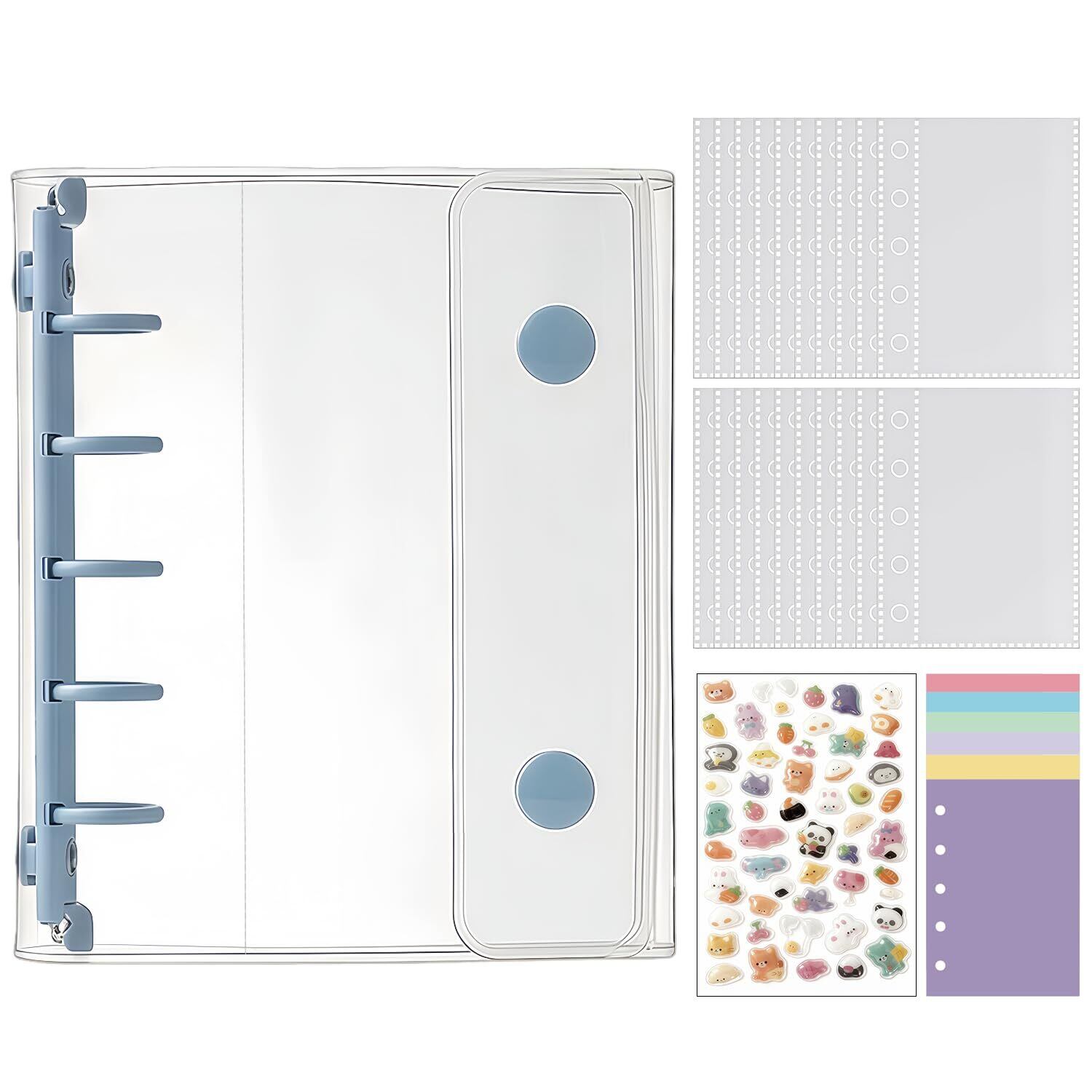 【特価商品】シール帳 透明 女の子 台紙 プラバン M5 サイズ はがせる 5穴 シール シール手帳 クリアバインダー シール収納 写真収納 推し活グッズ 3層構造PPシート(シール帳×1個 透明リフィル20枚+可愛い立体シールセット×1枚+カラーリフィル6枚) (ライトブルー)