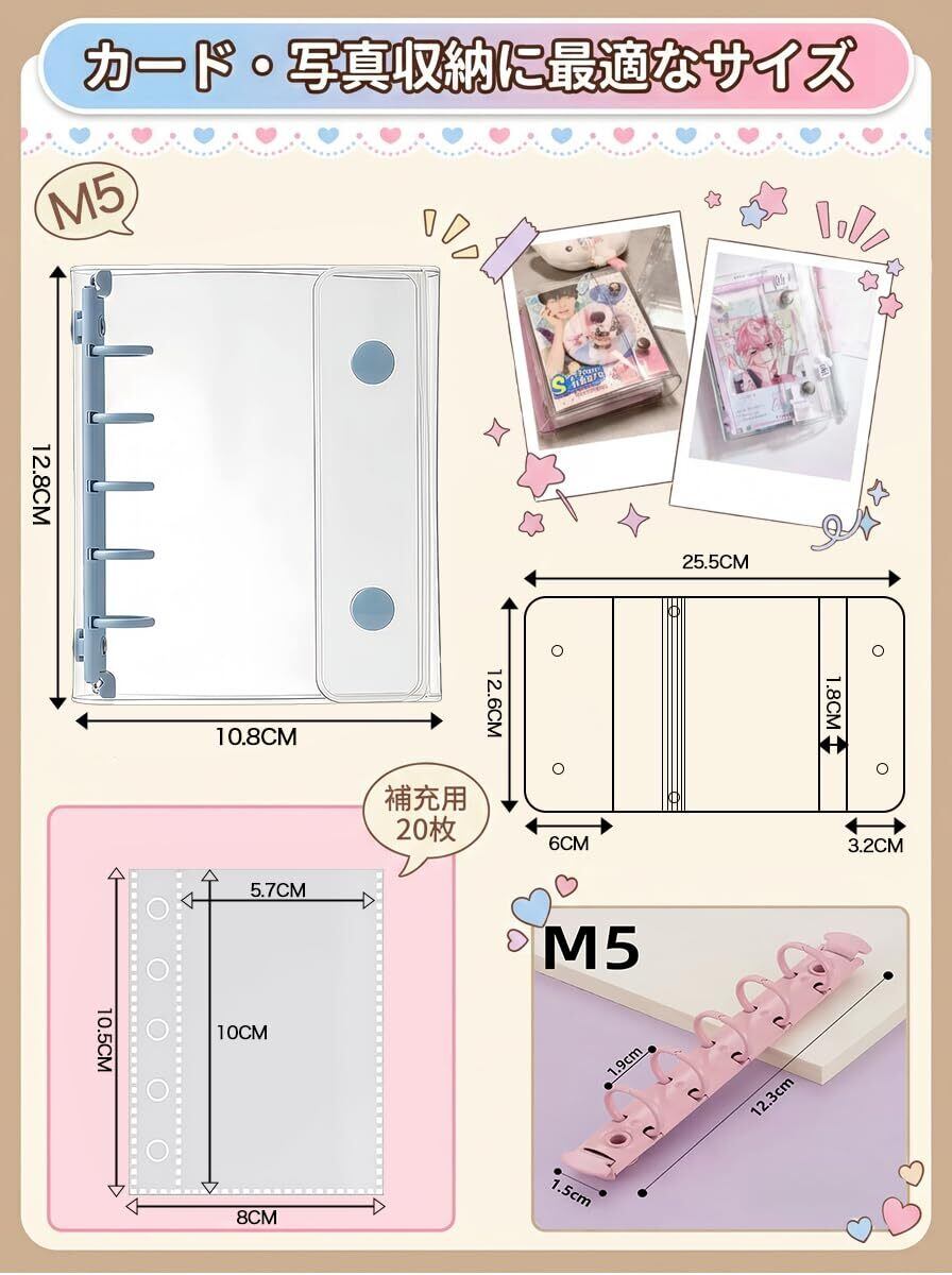 シール帳 透明 女の子 台紙 プラバン M5 サイズ はがせる 5穴 シール シール手帳 クリアバインダー シール収納 写真収納 推し活グッズ 3層構造PPシート(シール帳×1個 透明リフィル20枚+可愛い立体シールセット×1枚+カラーリフィル6枚) (ライトブルー)