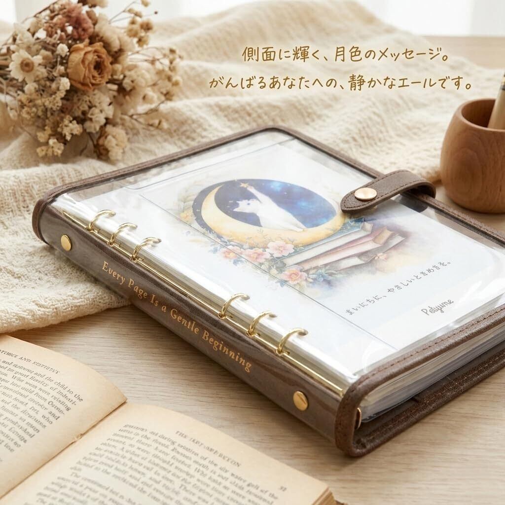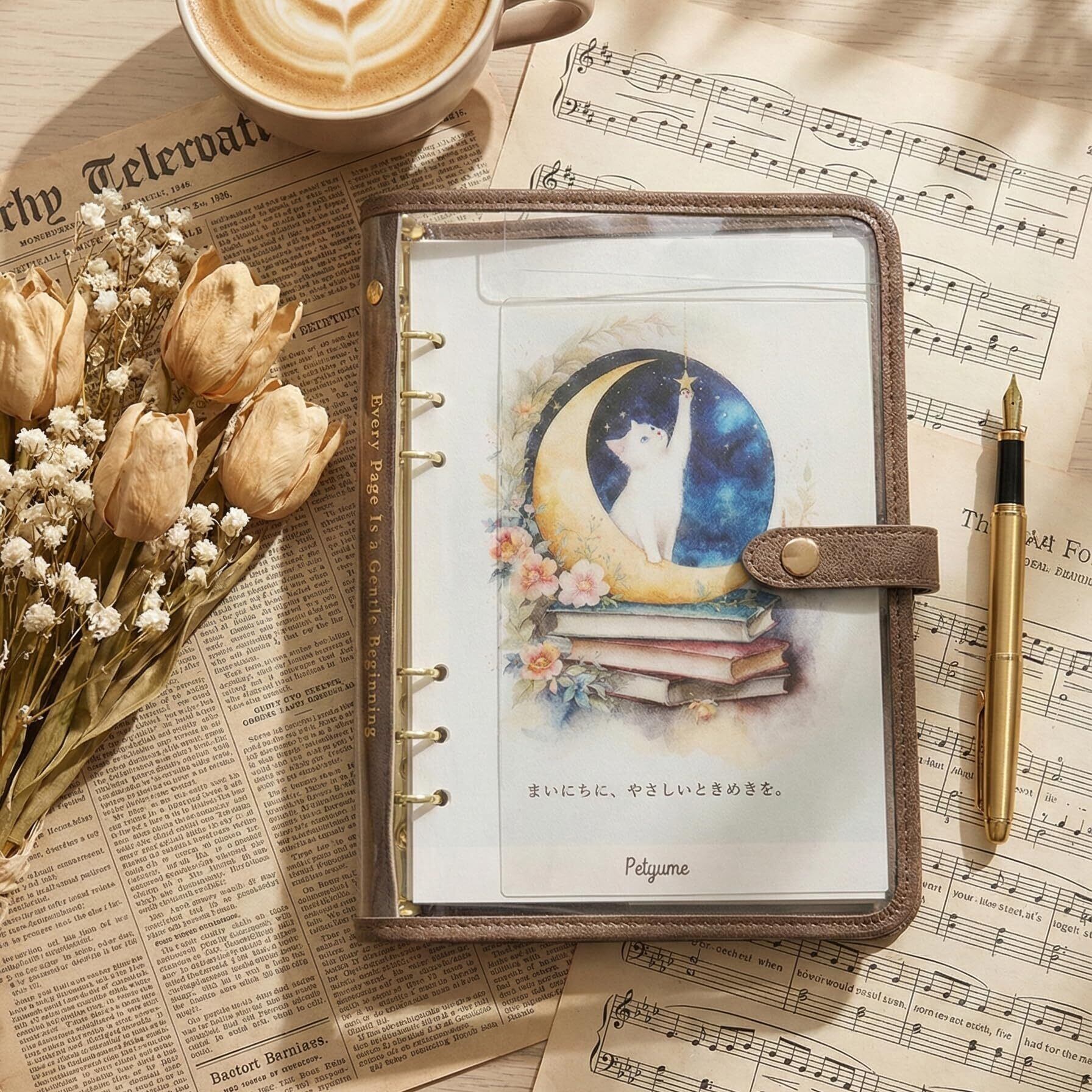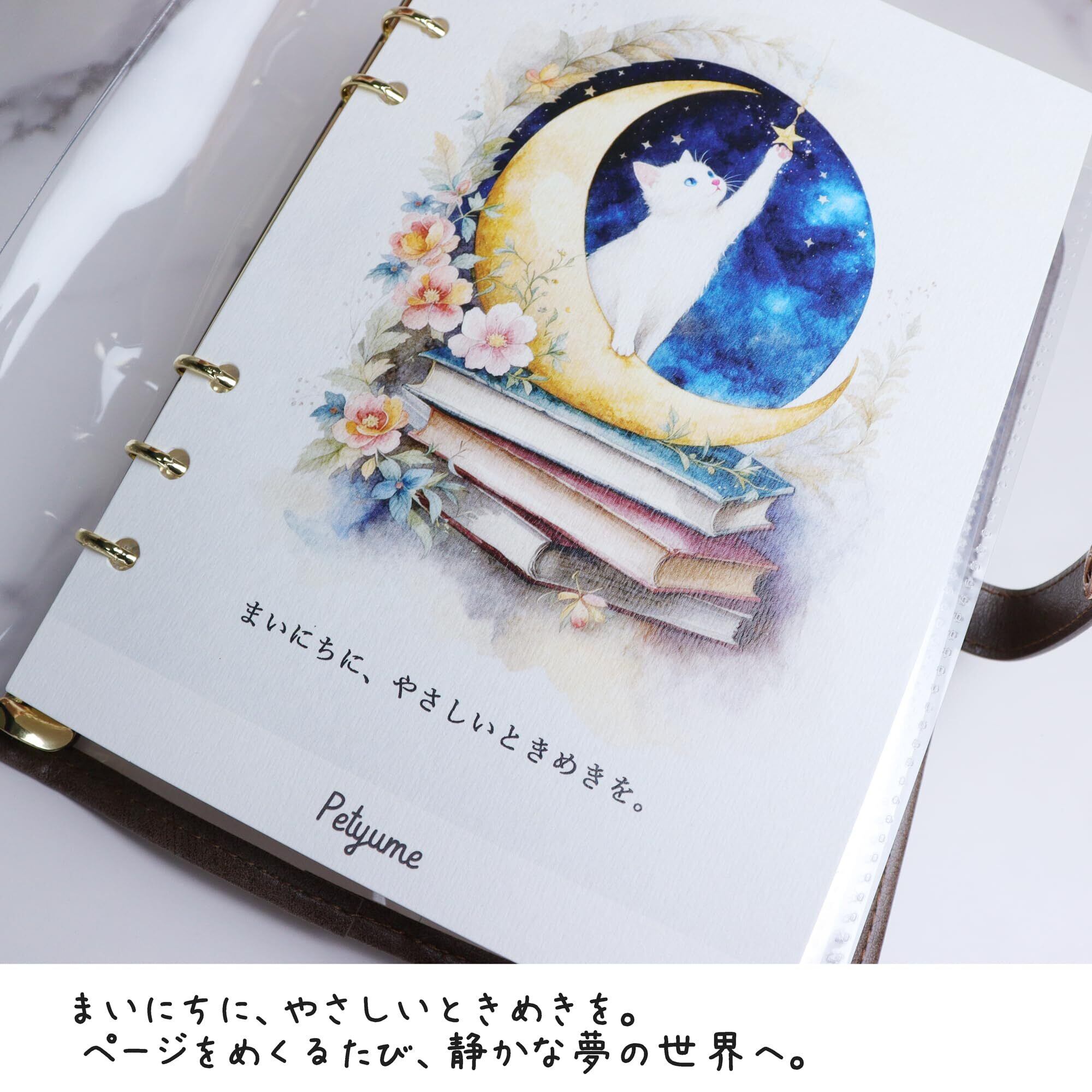触れるたび、気持ちが整う。 猫イラストを重ねた触感のある表紙と、 月色にきらめく箔押しメッセージ。 甘すぎない“かわいさ”を大切にした、 大人の毎日にそっと寄り添うシール帳です。 透明感のあるプラスチック素材に、 上品なゴールドリングと縁取り加工を施し、 イラストの美しさと、心地よい手触りを両立しました。 リフィルは 剥離シート台紙 と はがせる台紙ポケット の2種類。 ぷっくりシール、フレーク、マスキングテープまで、 種類を選ばず、迷わずきれいに整理できます。 表紙・裏表紙にはポケット付き。 シールはもちろん、メモや写真もまとめて収納でき、 集める時間が、きれいに続きます。 A5・6穴仕様で軽量・防水。 ダブルボタンで厚み調整ができるため、 日常使いのシール帳としても、 バインダーとしても、長くお使いいただけます。