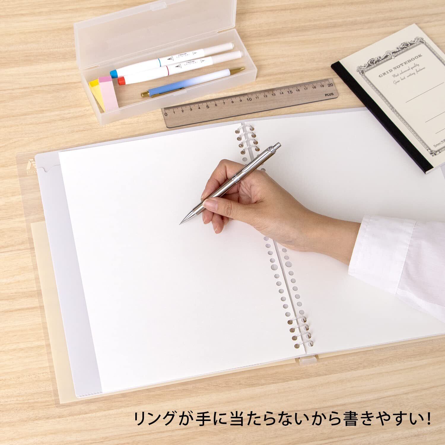 とじ具もリーフの着脱がしやすい、スライド式8穴リング付属品にはポケット付きのインナーカバーで、メモや付箋も手軽に収納が可能。
