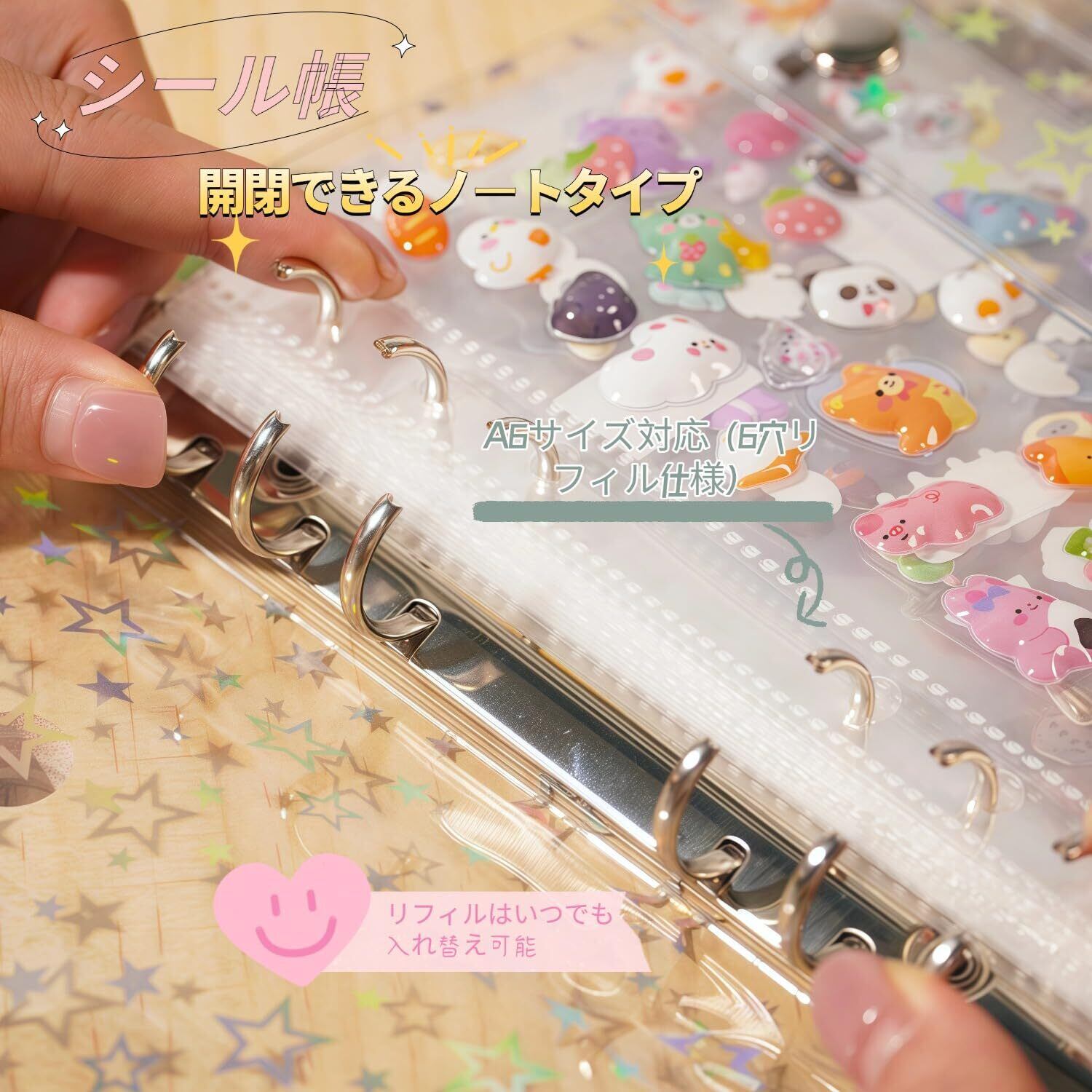 【自由にカスタマイズできる6穴バインダー式】 キラキラの金属製6穴リングで、リフィルの追加や交換がとっても簡単 サッと開け閉めできるから、気分やシールに合わせていつでもオリジナルなアルバムを作れます。 シールだけでなく、トレカやチェキも整理できる万能タイプ。 あなたの“好き”をたっぷり詰め込める、世界にひとつだけのシール帳を楽しもう
