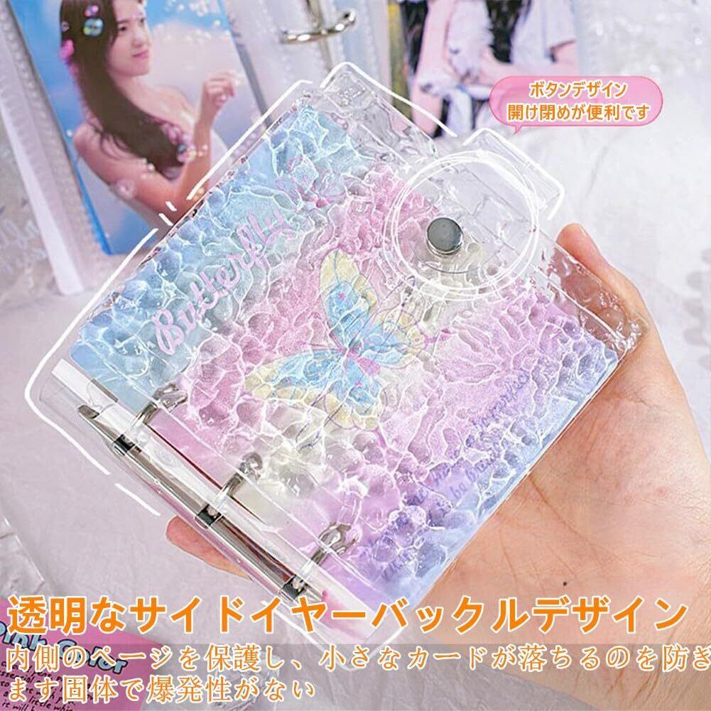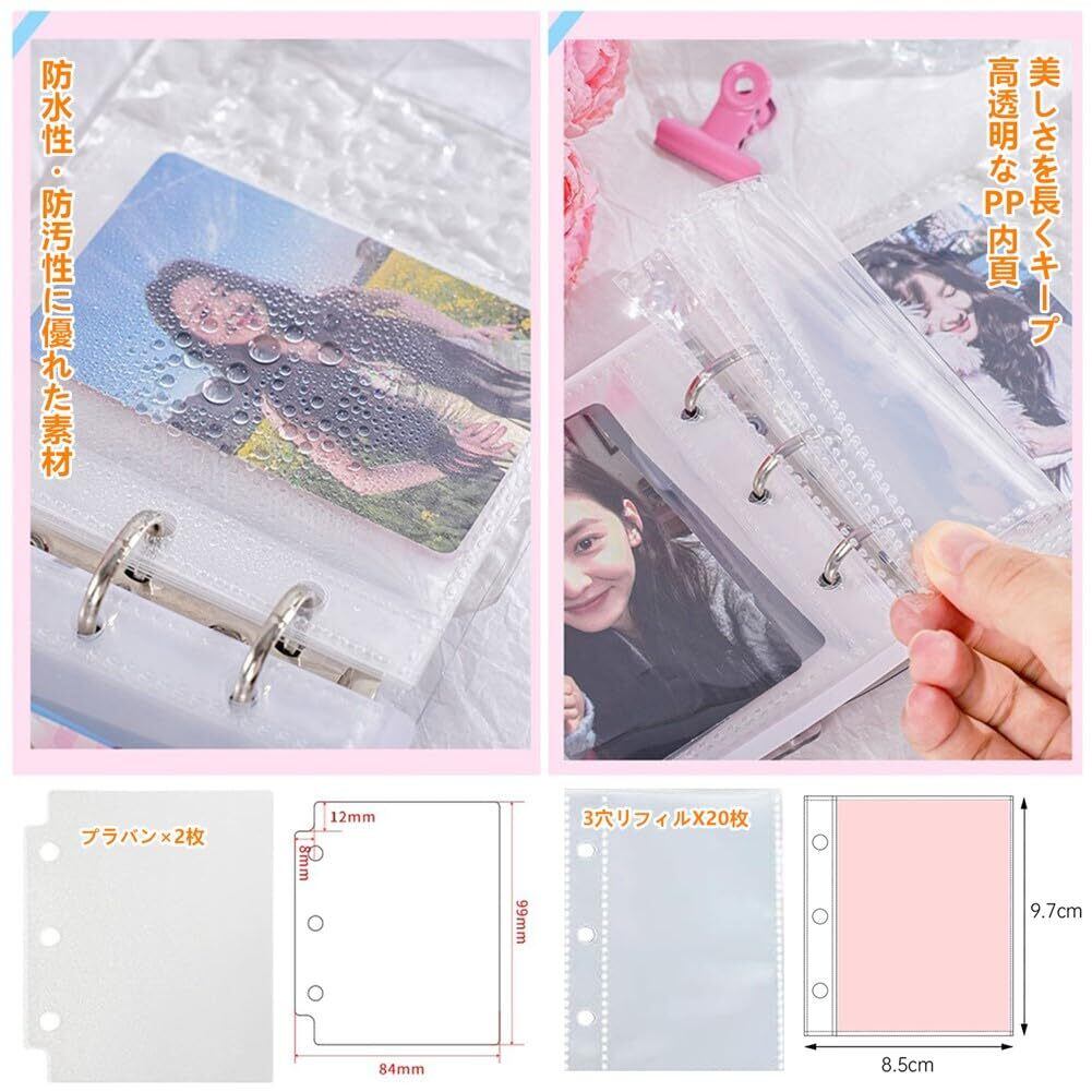 シール帳 女の子 はがせる 透明 ミニバインダー 3穴 ボタン付き リフィル20枚付き プラバン2枚 PP素材 シール帳 台紙 かわいい シール収納 詰め替え可能 手帳 プリ帳 カードスリーブ ポケット バインダー型ノート 女の子 コラージュノート 波紋タイプ 桜柄 12×11cm (ピンク/グリーン A8)