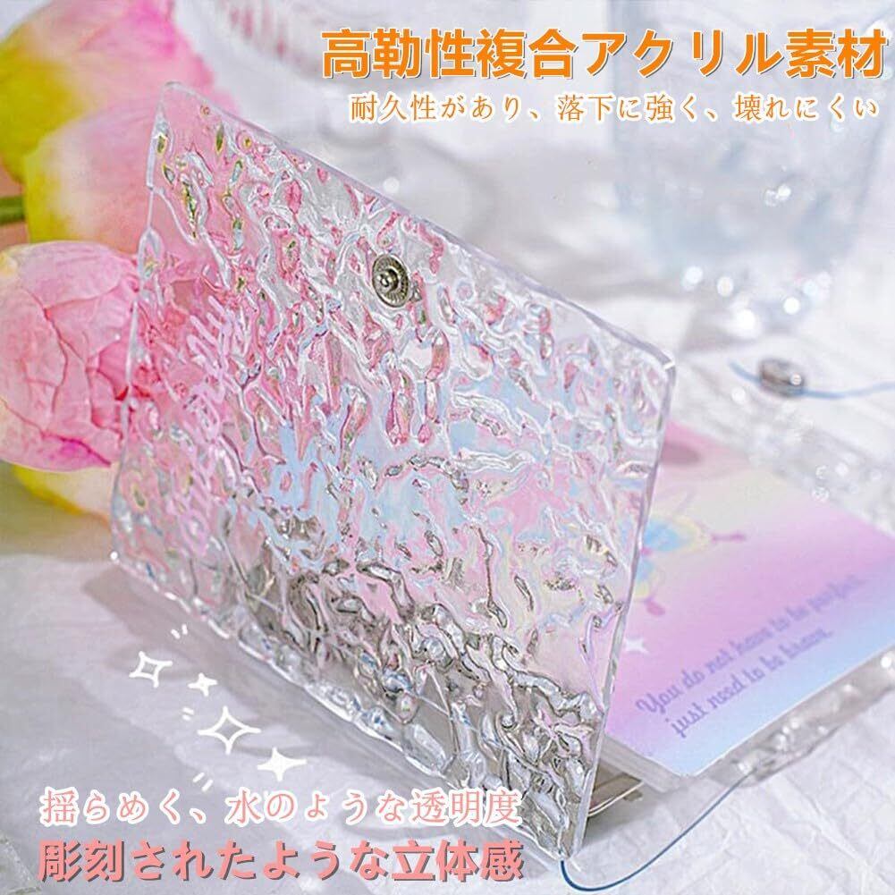 【高透明アクリル風バインダーで、コレクションを美しく展示】表紙は高透明な硬質アクリル風素材を採用し、高級感のあるキラキラ質感ながら、中身をしっかり保護。内頁も黄ばみにくい高透明PP素材を使用しているため、お気に入りのシールやカードの美しさをそのまま引き立てます。おしゃれなシール手帳として、女の子から大人まで満足のデザインです。