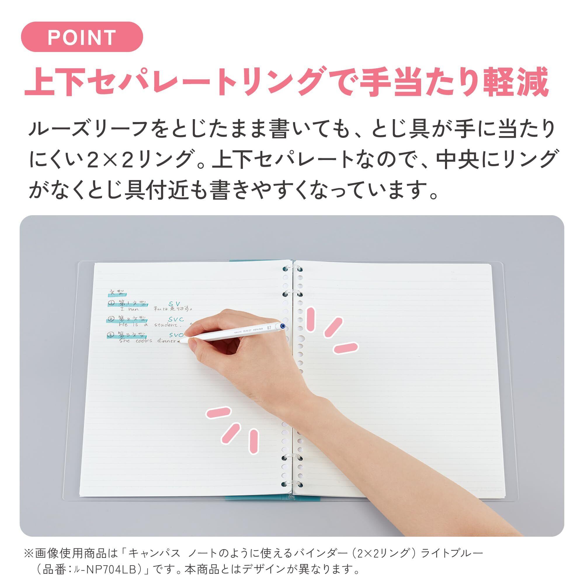 ・ルーズリーフを綴じたまま書いても綴じ具が手に当たりにくい2X2リング