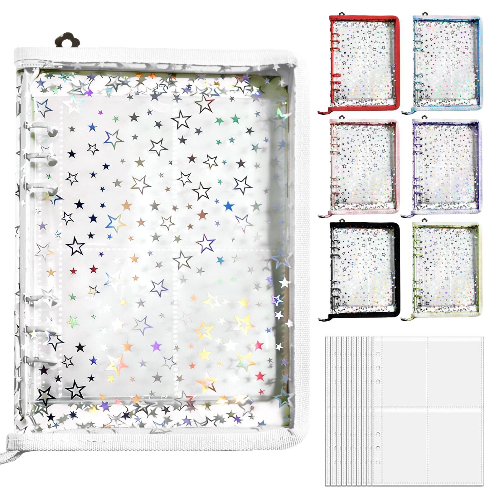 シール帳 A5 リフィル10枚付き 透明 バインダー 6穴 女の子 トレカ収納 大きめ 星柄 推し活グッズ おしゃれ 可愛い ファスナー付き (シール帳, ホワイト, A5)