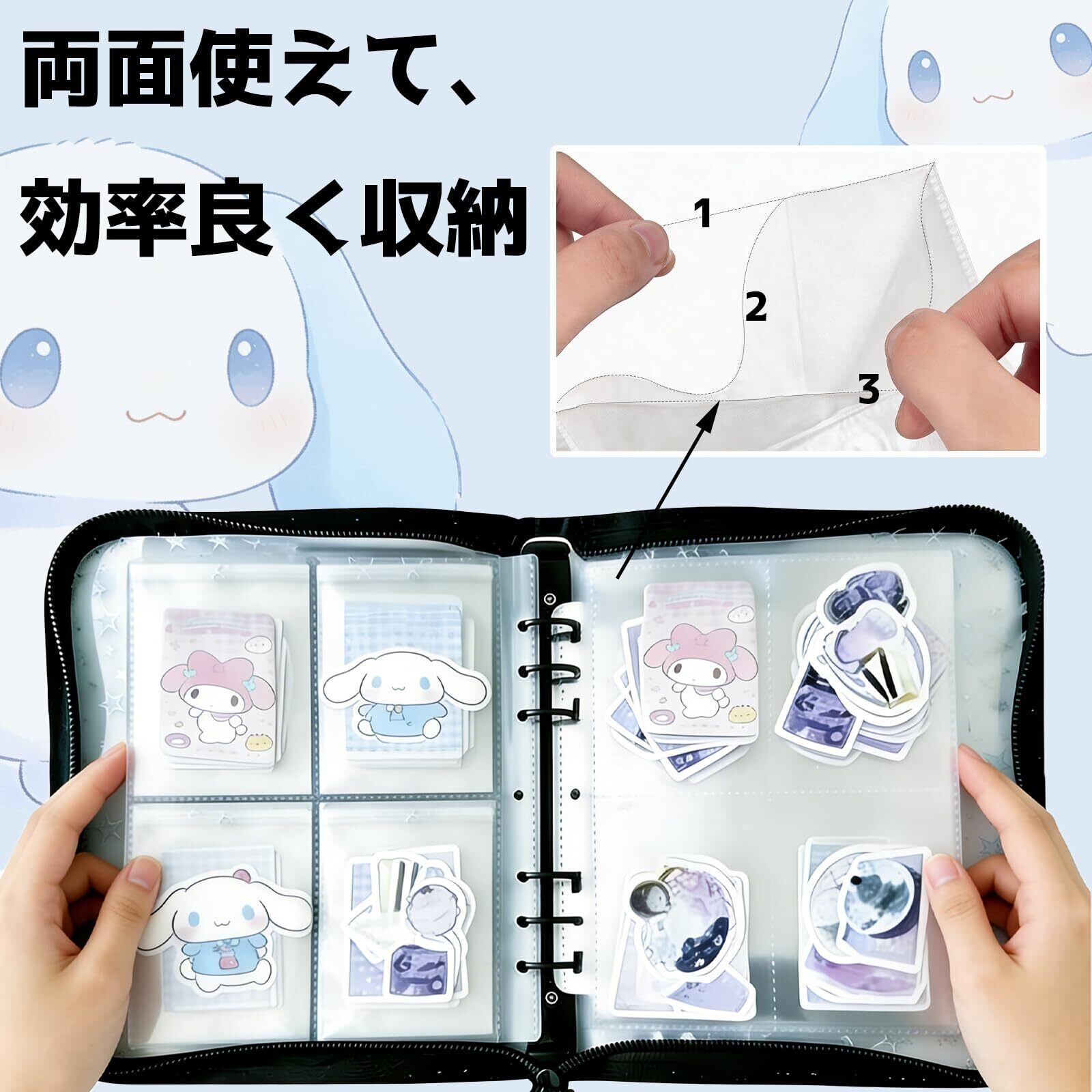 【シール帳 - ファスナー仕様】ぐるっと一周ファスナーでしっかり閉じられる全周ジッパー仕様。トレカ・写真・メモが落ちにくく、外出時も安心して持ち歩けます。 バッグの中でも中身が散らばりにくい設計です。