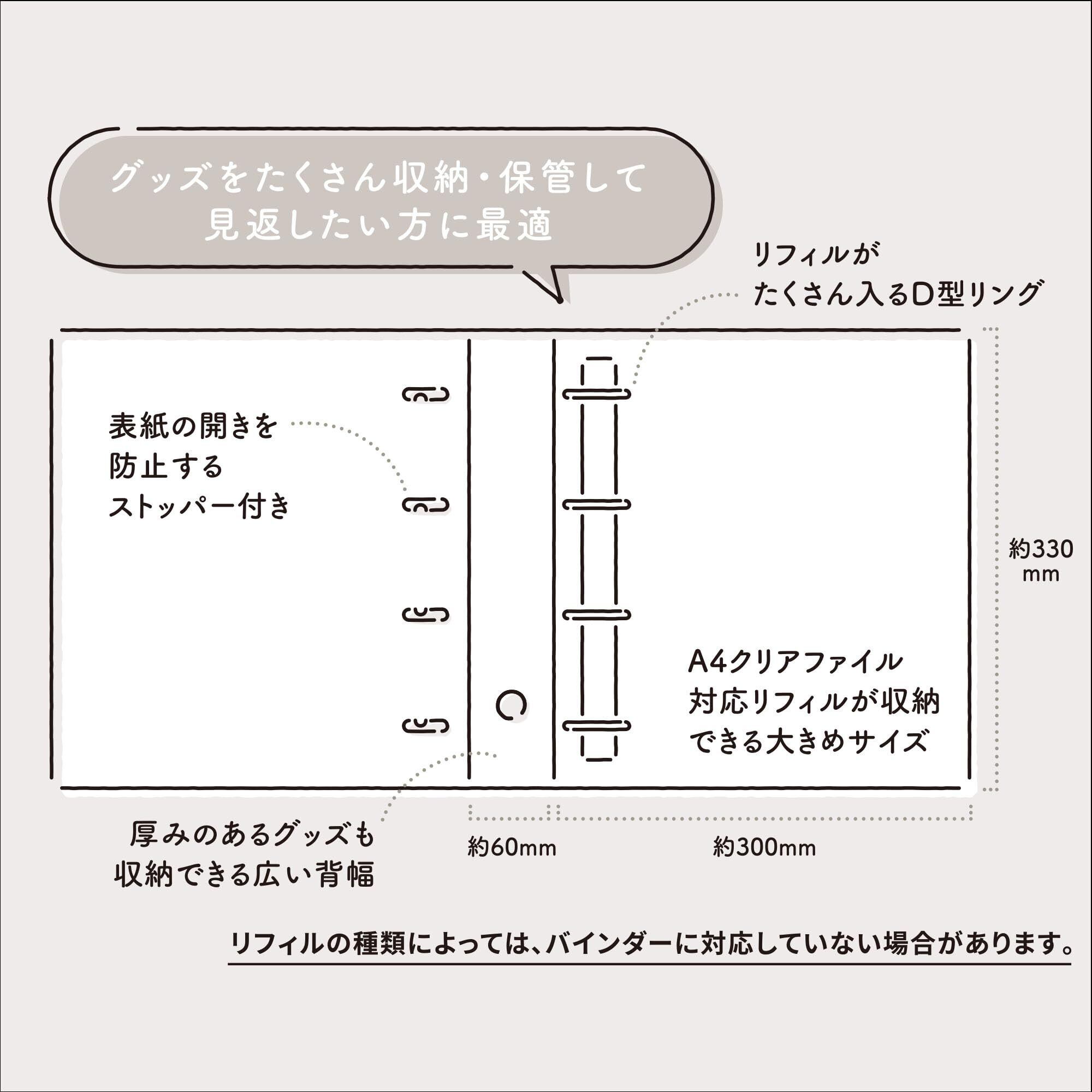 【推し活収納系インフルエンサー『mico』監修】増え続けるグッズを一冊にまとめるD型4穴金具を使用したリフィル式のバインダー。A4ワイド設計で各社リフィルに高い互換性を持ち、カードからアクスタまで多彩なアイテムを収納できます。独自開発の厚手PP素材と4箇所のストッパー構造により、大量のコレクションを収納しても安定して自立。シンプルな白色デザインでどんなインテリアにも自然に馴染みます。