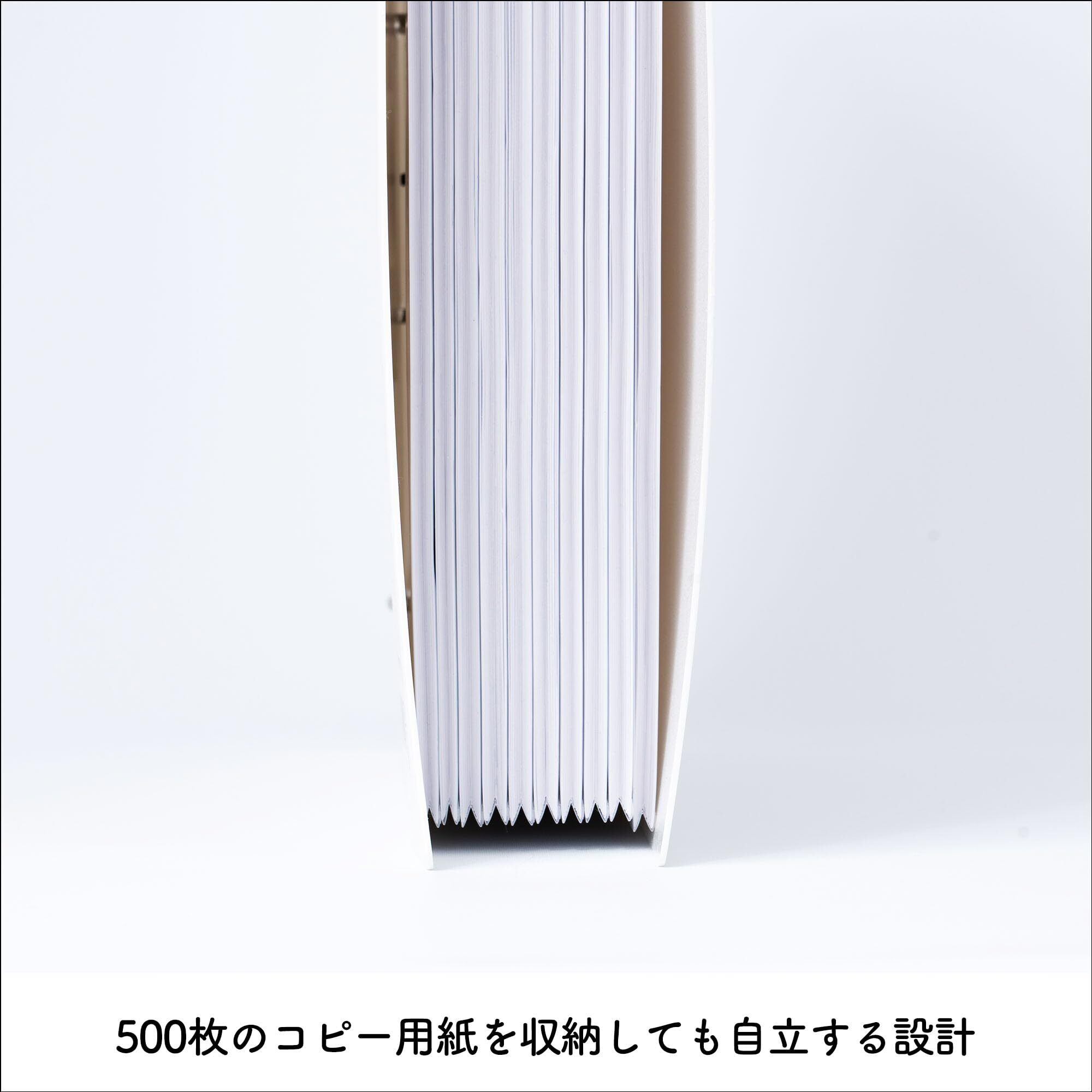 【安定した自立構造と強化された表紙】バインダーが安定して自立できるように、厚手のPP素材を独自に開発。さらに、一般的な4穴バインダーが2箇所のストッパーしか持たないのに対し、イレールバインダーは4箇所にストッパーを採用しています。この構造により、多くのグッズを収納しても、バインダー全体のバランスが保たれ、500枚のコピー用紙を収納しても自立する安定性を持っています。