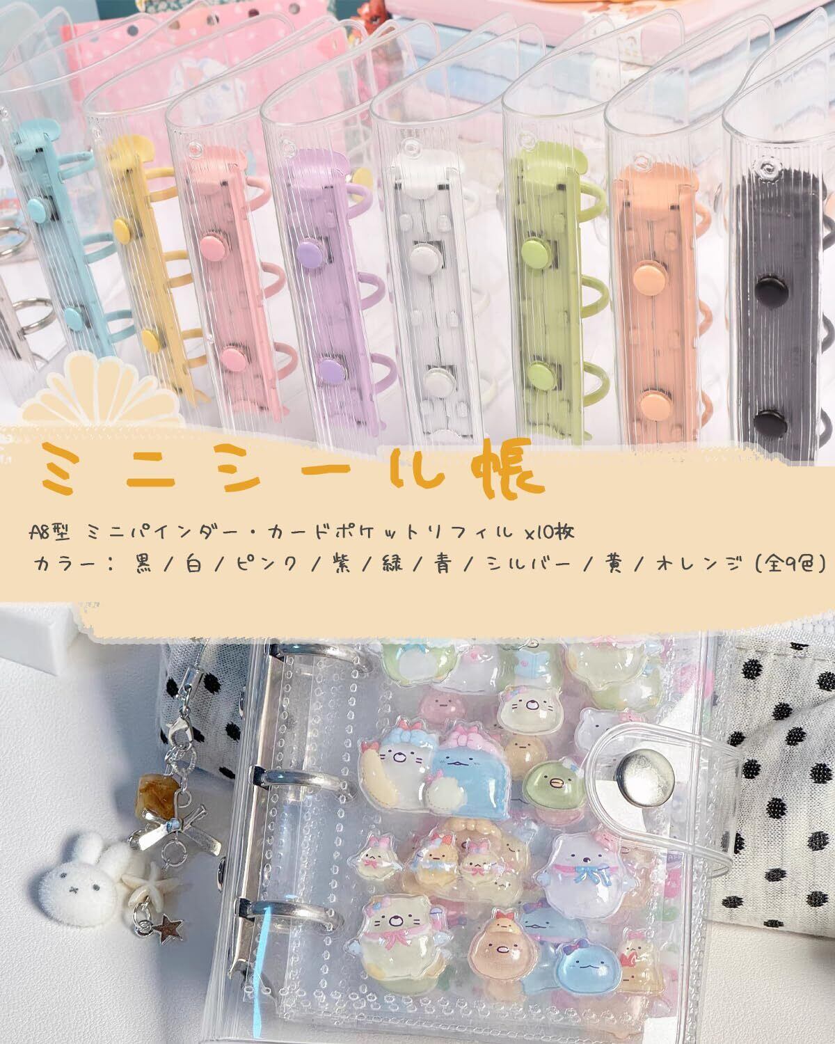 シール帳 透明 A8 女の子 ミニ 3穴 バインダー リフィル*10枚 PPシートカードポケット シール台紙 手帳 クリア プリ帳 カードスリーブ かわいい 透明シール帳 シール 高透 厚手素材 (イエロー)