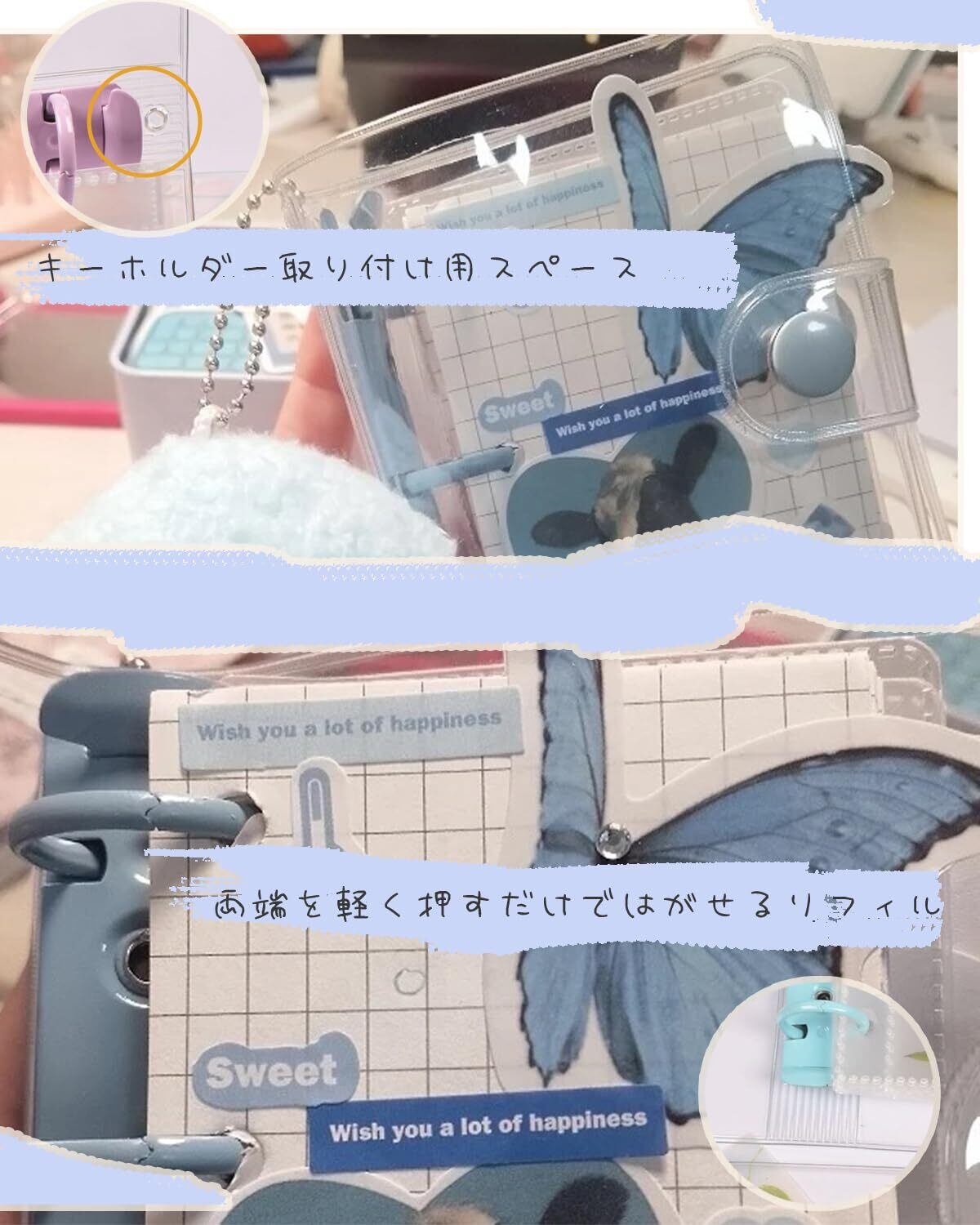 【付け外し簡単!3リング式で中身を自由にカスタマイズ】このシール帳 透明は3リング式のため、付属の10枚のリフィルはもちろん、お気に入りのシール台紙やポケットシートを簡単に追加・交換でき、シールの整理整頓がとてもはかどります。